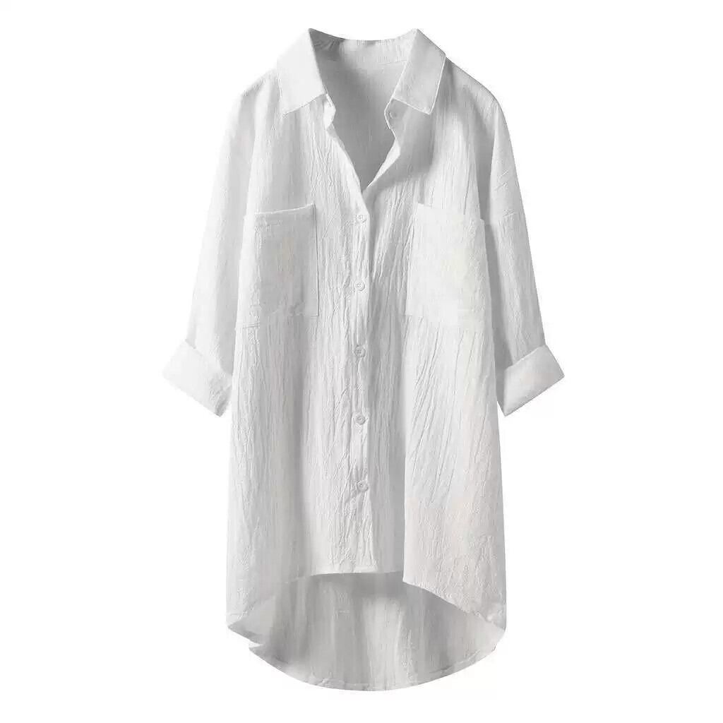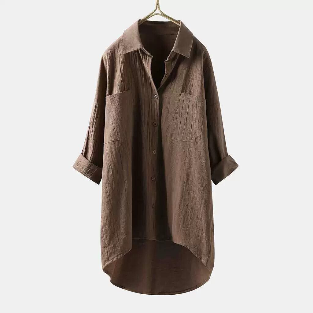クリアランス漏れ ~ 女性用無地のコットンとリネンのラペル シャツ、ゆったりとしたカジュアルなリネンの長袖シャツ、カウンターからのトップス ロング ソリッドカラー sine19426555631