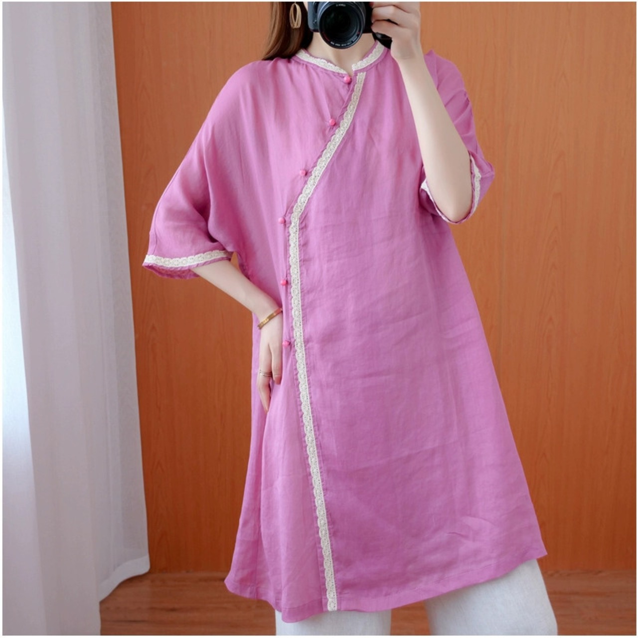 ファットシスター大きいサイズ半袖シャツTシャツ夏ルーズレトロスタンドカラー斜めラペル改良チャイナドレスミドル丈トップスカート 大きめサイズ サマー 夏物 sine93518028761