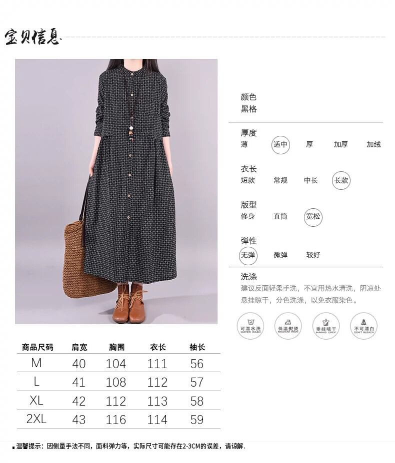 コットンとリネンのドレスの女性の春と秋のゆったりとした大きいサイズの太ったmm長袖チェック柄スリミング膝高リネンミドル丈シャツドレス ロング 大きめサイズ スプリング 春物 オータム 秋物 sine90977372434
