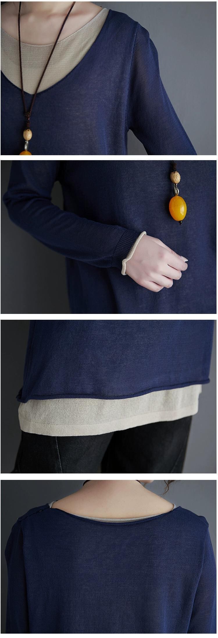 スタイルプラスサイズの女性のフェイクツーピースボトリングシャツ秋と冬ルーズスプライシングコントラスト腹部カバーセーターコットンとリネントップ 大きめサイズ オータム 秋物 ウィンター 冬物 sine45112855448