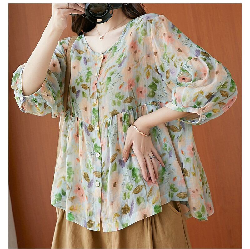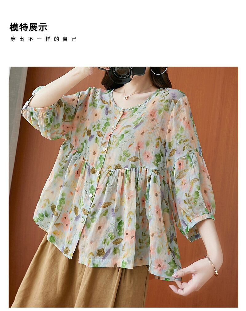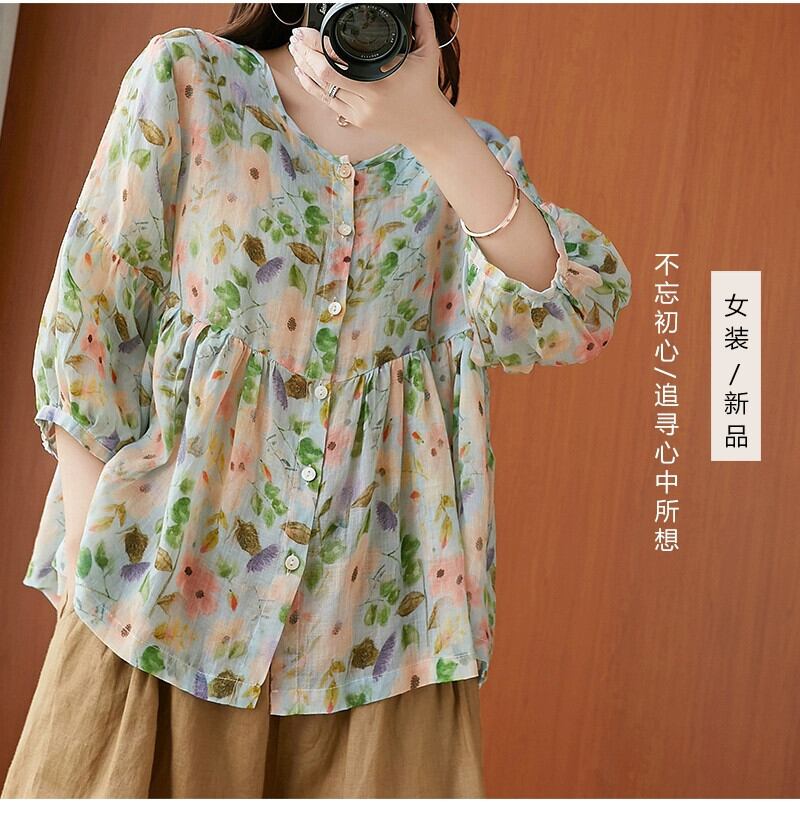 プラスサイズプラスサイズの女性の綿とリネンのシャツ Tシャツ夏ルーズカラー腹カバーカーディガンスリミング 5 分袖ドールシャツ コットン 大きめサイズ サマー 夏物 sine8801310486