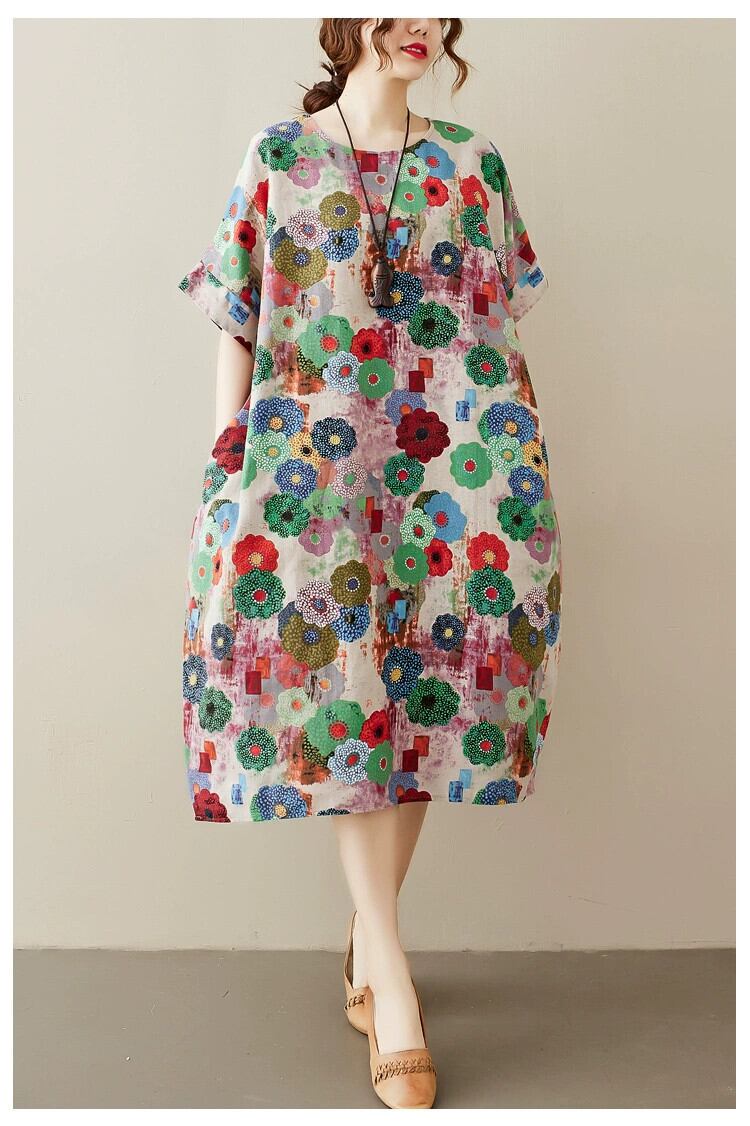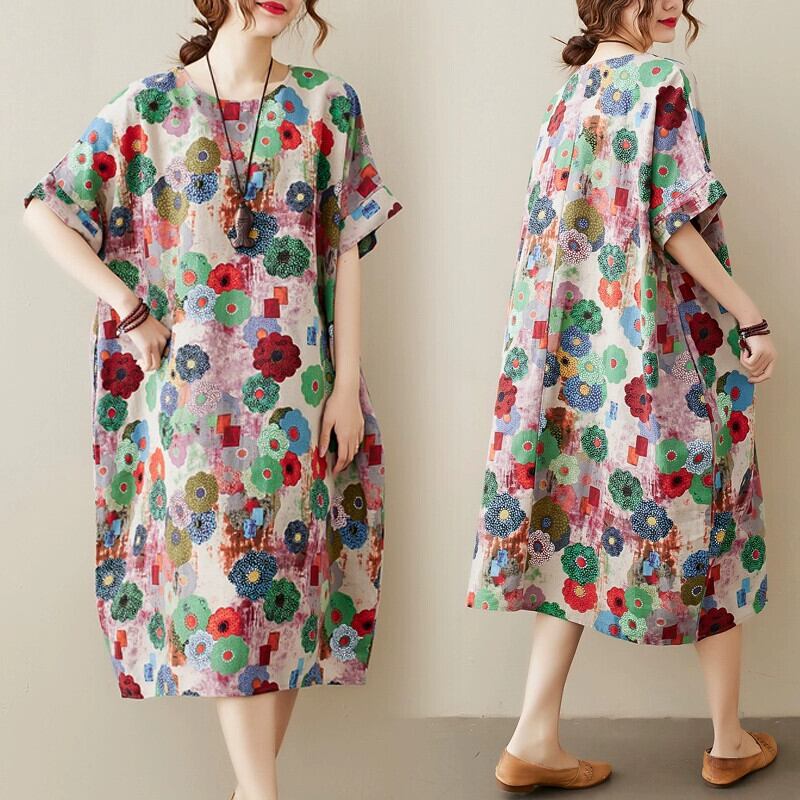 ファットシスターコットンとリネンドレスサマースタイルルーズ年齢軽減カラー腹カバーミッドレングスプラスサイズレディース半袖aラインスカート 大きめサイズ 夏物 sine80306640289