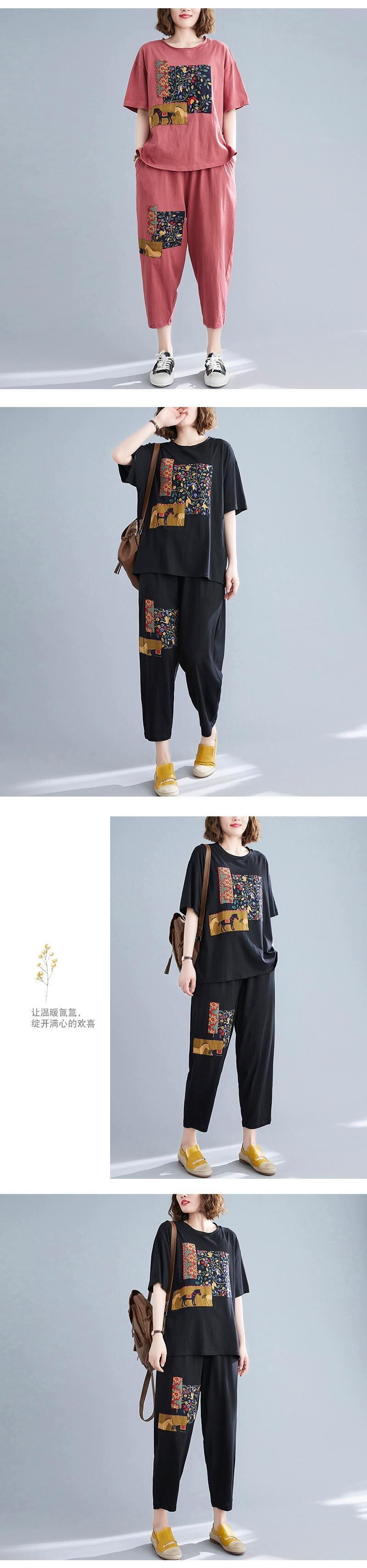 洋風パッチワークスーツレディース、夏半袖Tシャツトップス、カジュアルハーレム9点パンツ、大きいサイズレディース綿麻2点セット コットン 大きめサイズ サマー 夏物 sine90139621008