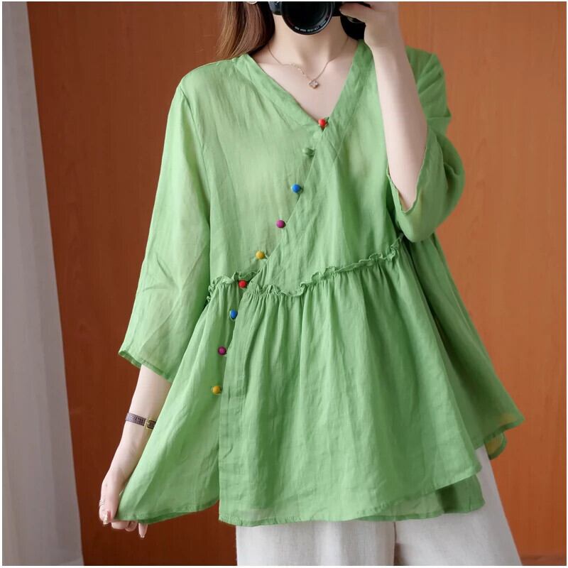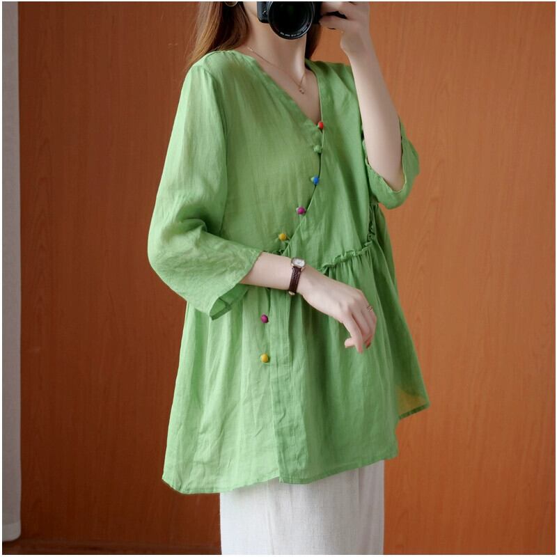 綿とリネンのシャツの女性の夏プラスサイズの女性の文学レトロな斜めの前立てボタン V ネックルーズラミー人形シャツトップ コットン 大きめサイズ サマー 夏物 Vネック sine6712860296