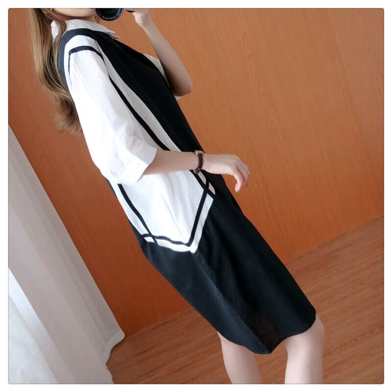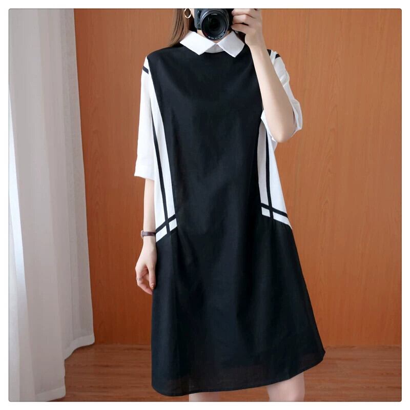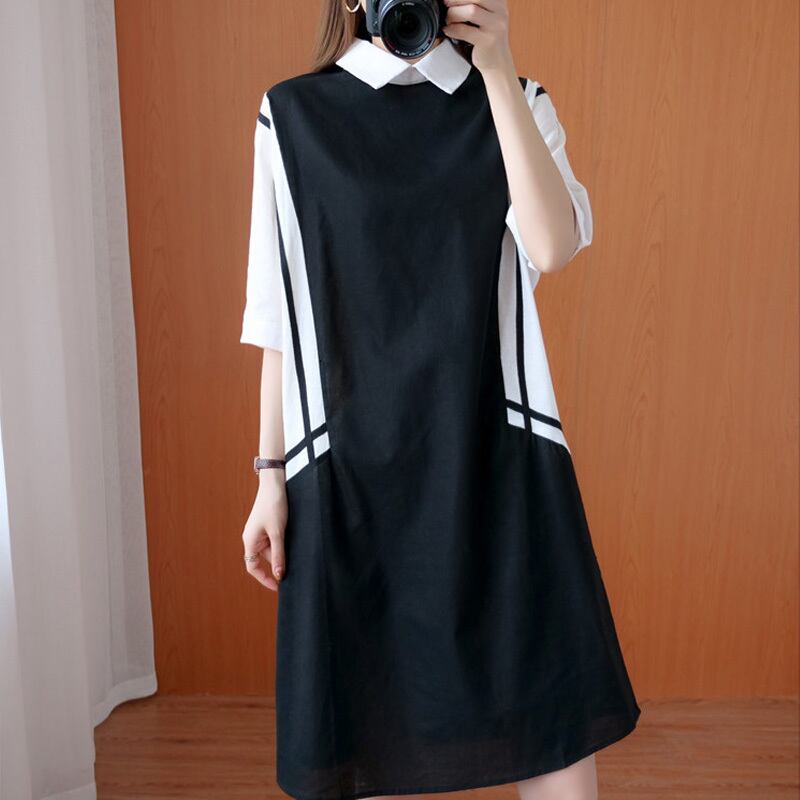 ウエスタンプラスサイズの女性の芸術的なドレス夏の新しい緩い年齢を軽減するラペルステッチコントラストカラーのミッドレングスのシャツドレス 大きめサイズ サマー 夏物 sine92058613394