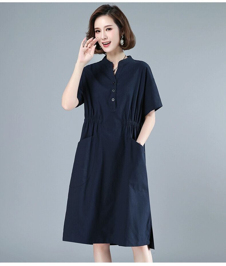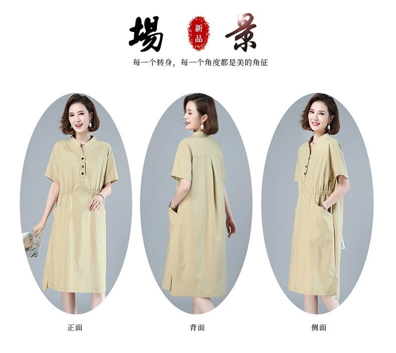 コットンとリネンのドレスの女性の夏のスタイルルーズファットMM気質無地ウエストミッドレングス半袖Aラインスカートプラスサイズの婦人服 大きめサイズ サマー 夏物 ソリッドカラー sine43401130338
