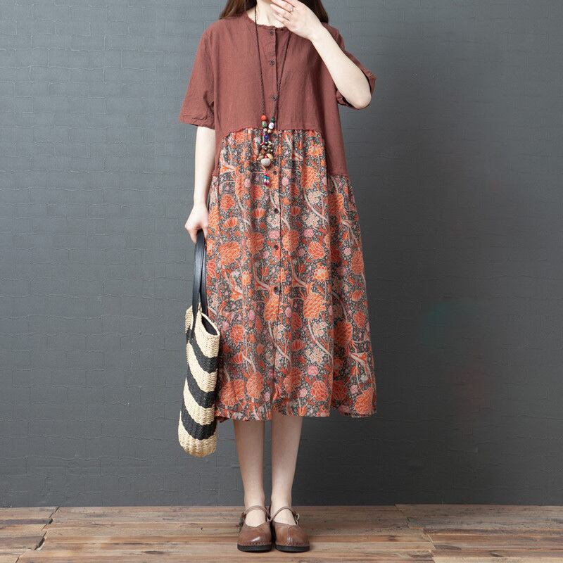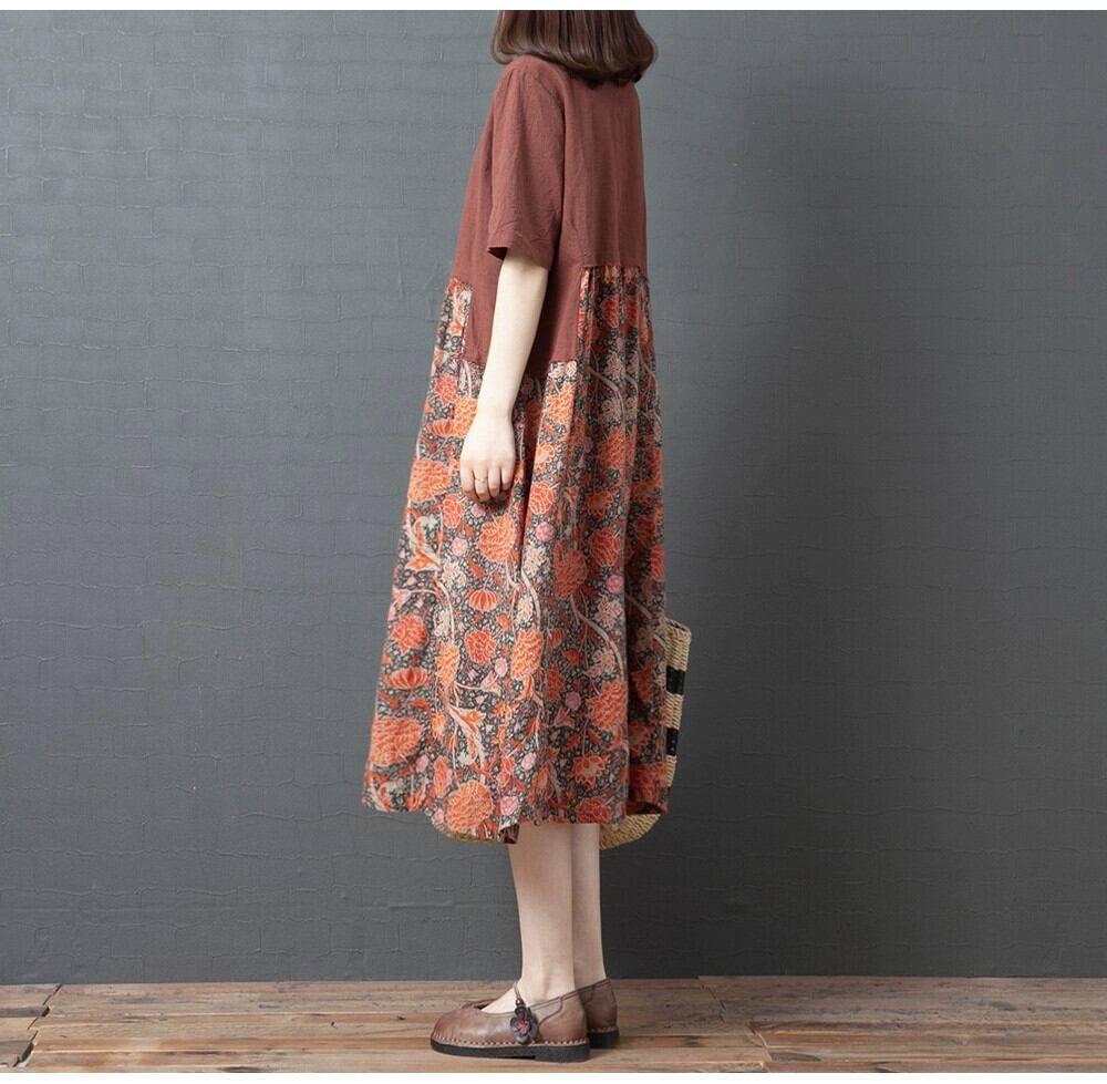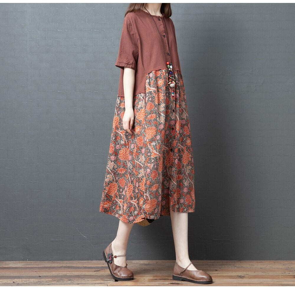エスニックスタイルリネンドレスレディース夏ゆったり大きいサイズプリントコントラストパッチワークシャツ半袖コットンとリネンのミドル丈スカート 大きめサイズ サマー 夏物 sine46328423660