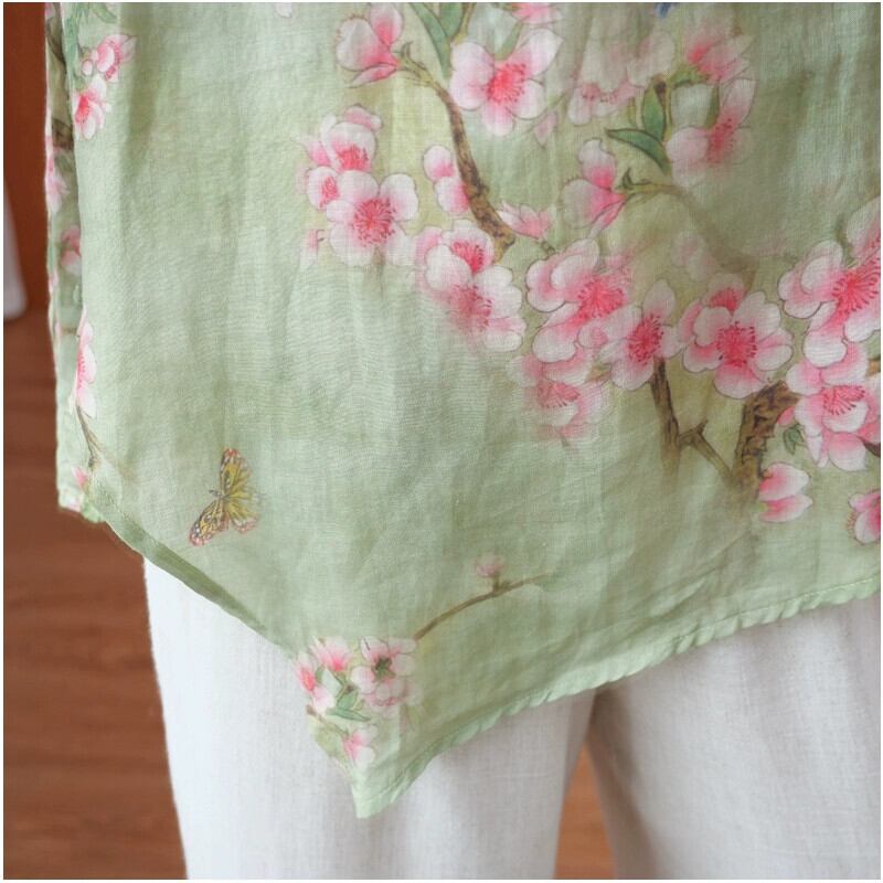 西洋スタイルの大きいサイズの女性の綿とリネンのシャツ Tシャツ夏新ルーズ中国風のプリントディスクボタンスタンドカラー不規則なティースーツ コットン 大きめサイズ sine91918560342
