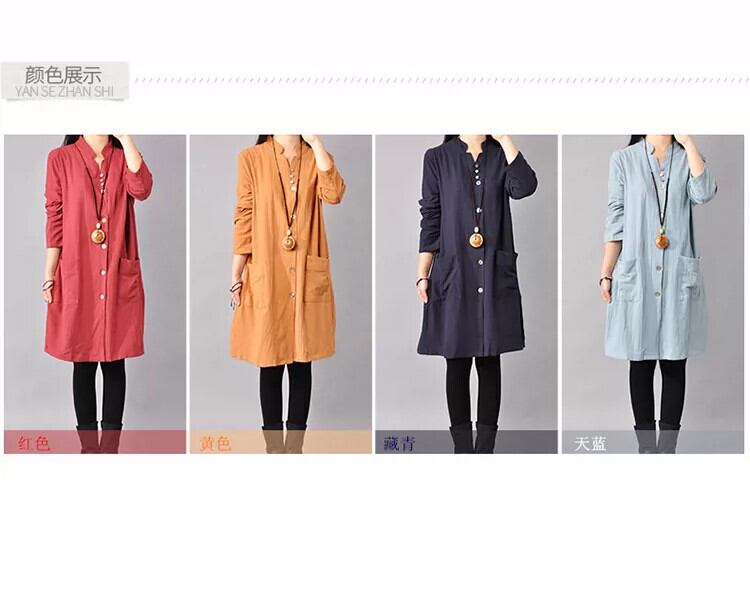 コットンとリネンのドレスの女性の新しい春と秋のゆったりとした大きいサイズのスタンドカラースリムカジュアル長袖ミドル丈リネンシャツドレス ロング 大きめサイズ スプリング 春物 オータム 秋物 sine19616814877