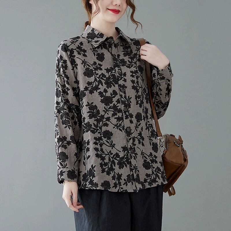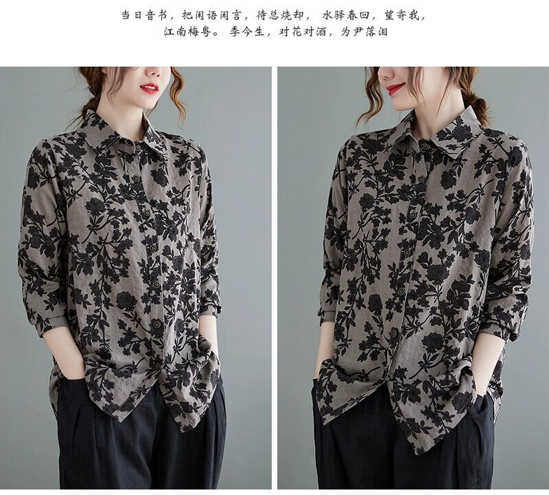 プラスサイズの女性の脂肪 mm 綿とリネン長袖シャツ 2022 春と秋ルーズレトロ花柄リネンカジュアルトップ ロング コットン 大きめサイズ スプリング 春物 オータム 秋物 sine77983098705