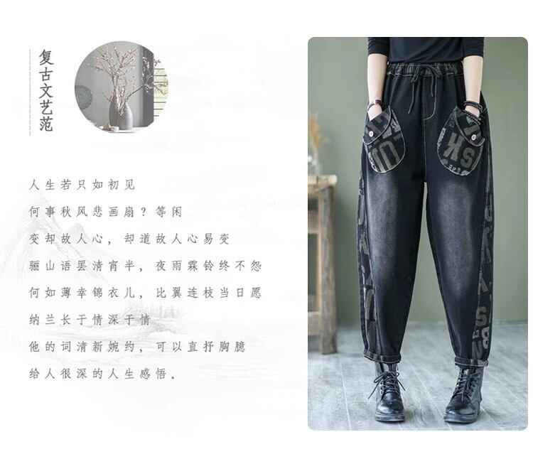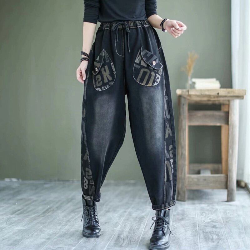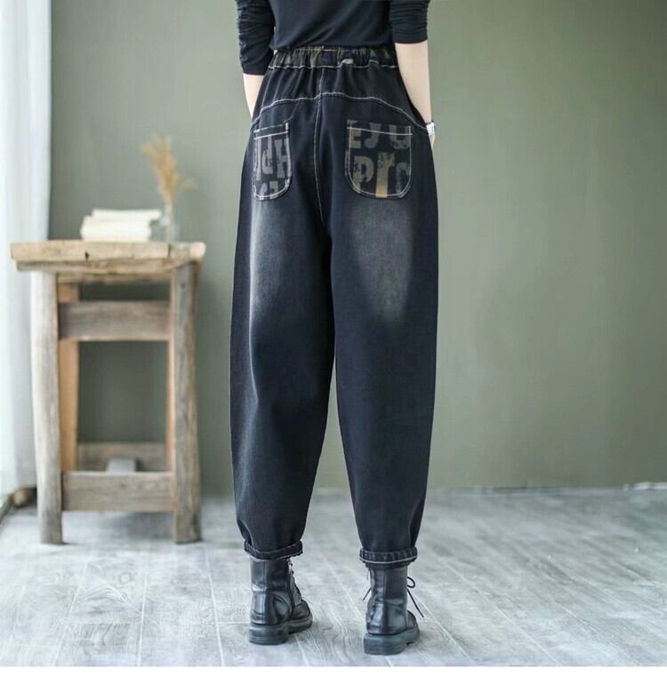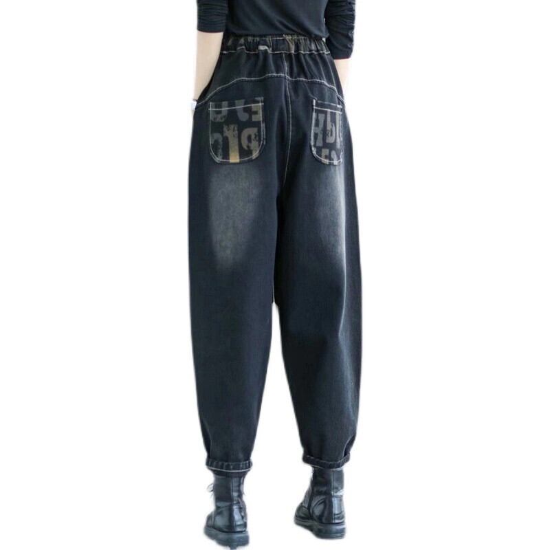 ファットシスターデニムハーレムパンツ女性の秋 2021 冬服ルーズ大きいサイズプリントユーズド加工ベルベットキャロットパンツ 大きめサイズ オータム 秋物 ウィンター 冬物 sine65975830664