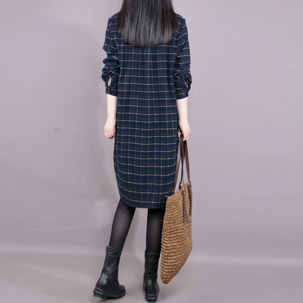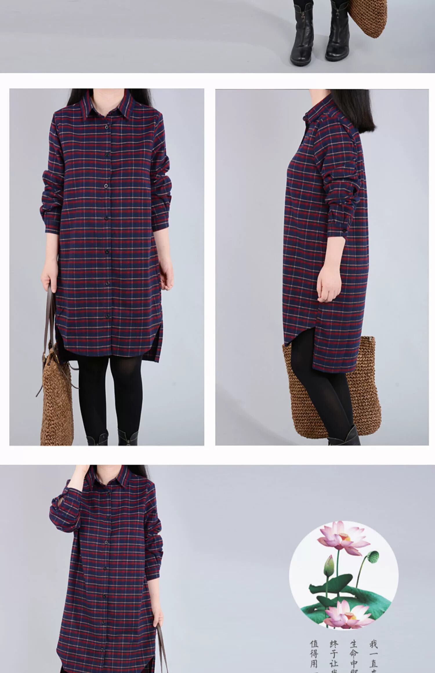 春と秋のコットンとリネンドレスゆったり大きいサイズスタイルスタイルラペルチェック柄ミッドレングスリネン長袖シャツドレス ロング 大きめサイズ スプリング 春物 オータム 秋物 sine44582965161