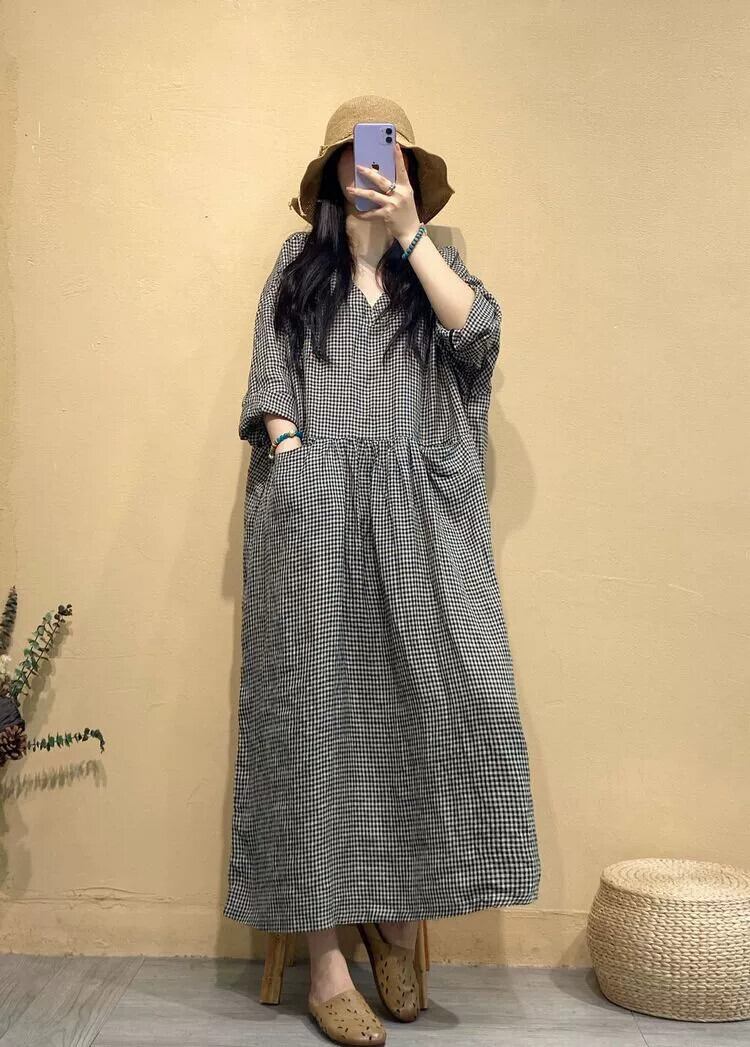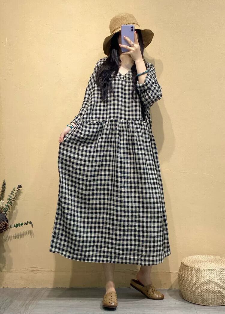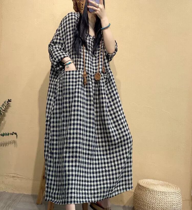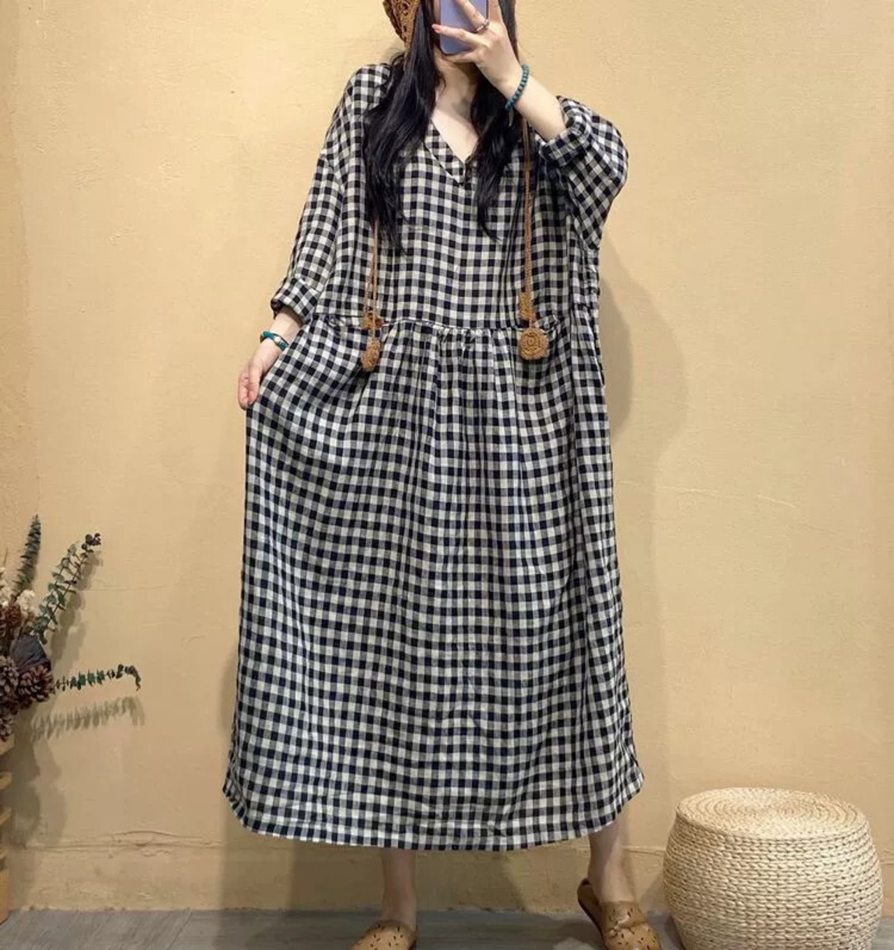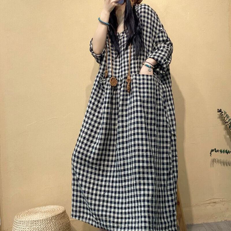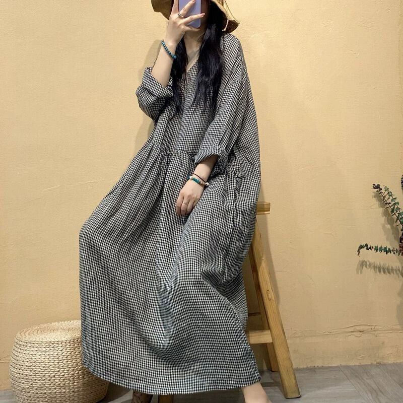 綿麻長袖ワンピース2022年春秋冬 ロング コットン 大きめサイズ スプリング 春物 オータム 秋物 スカート Vネック sine67940647073