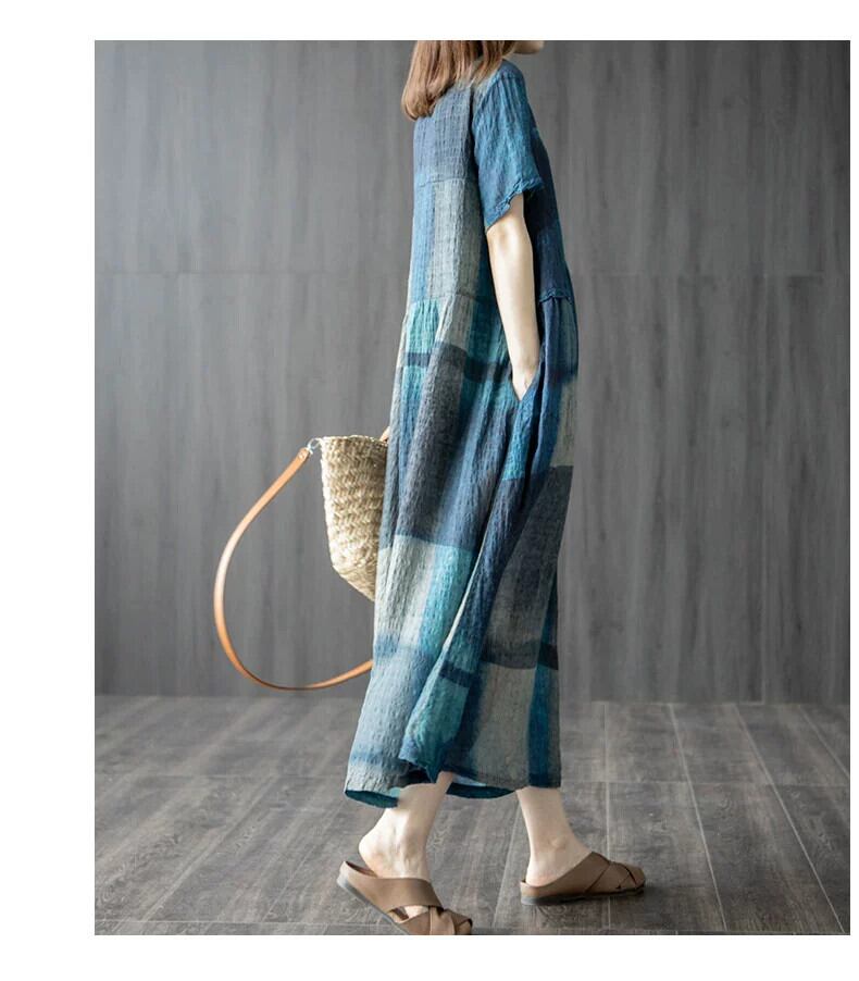 コットンとリネンのドレスの女性の夏のゆったりとした大きいサイズのエスニックスタイルの文学的なチェック柄が肌をカバーし、年齢を減らすVネックのリネンのミドル丈のスカート 大きめサイズ サマー 夏物 sine67426959292
