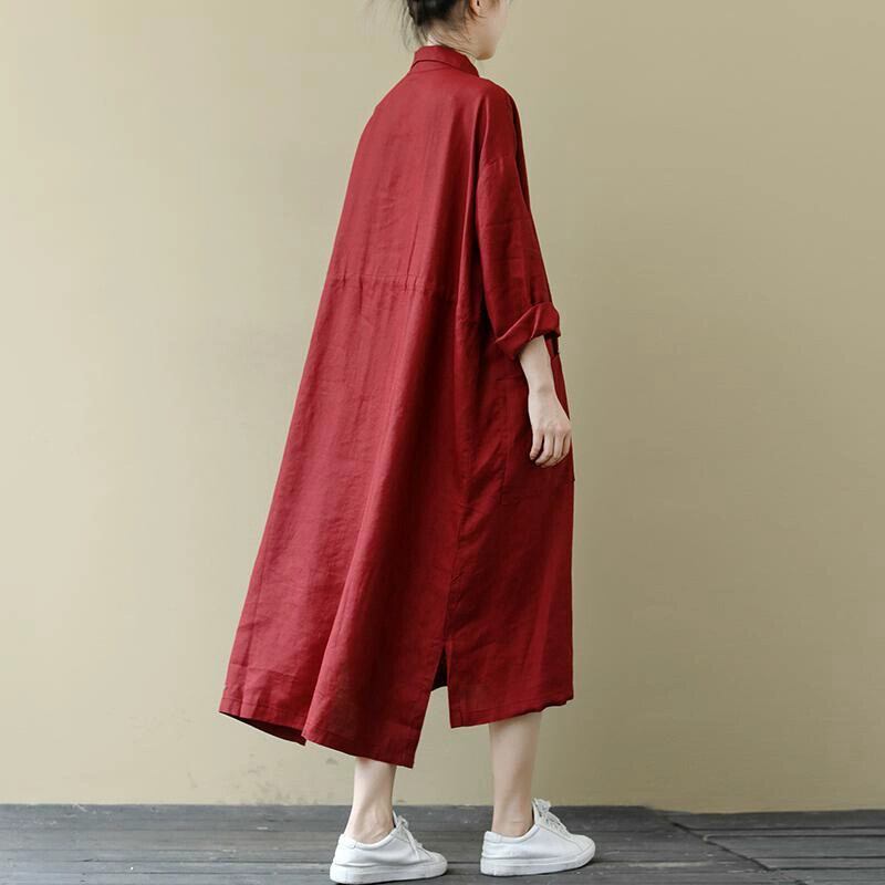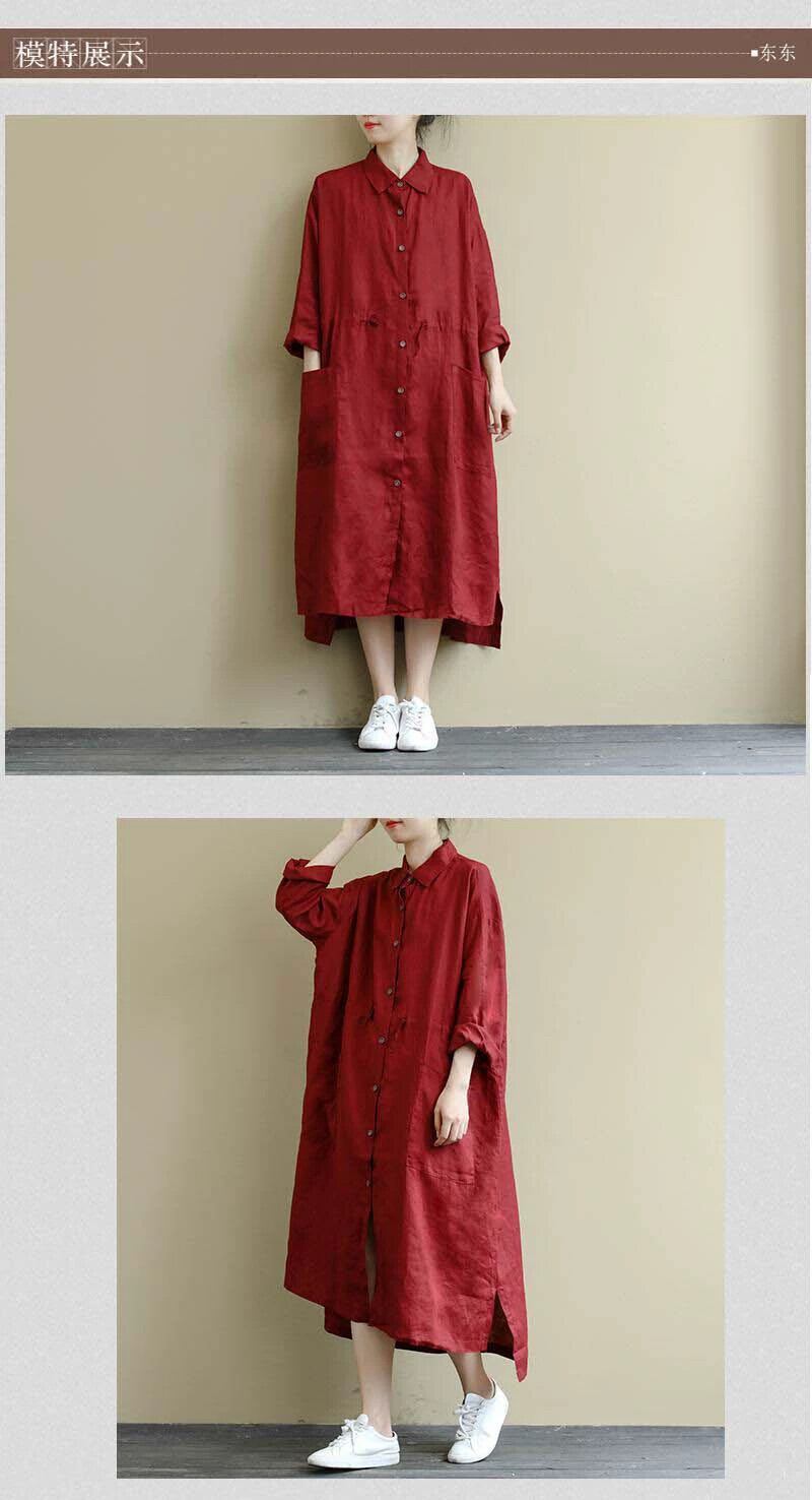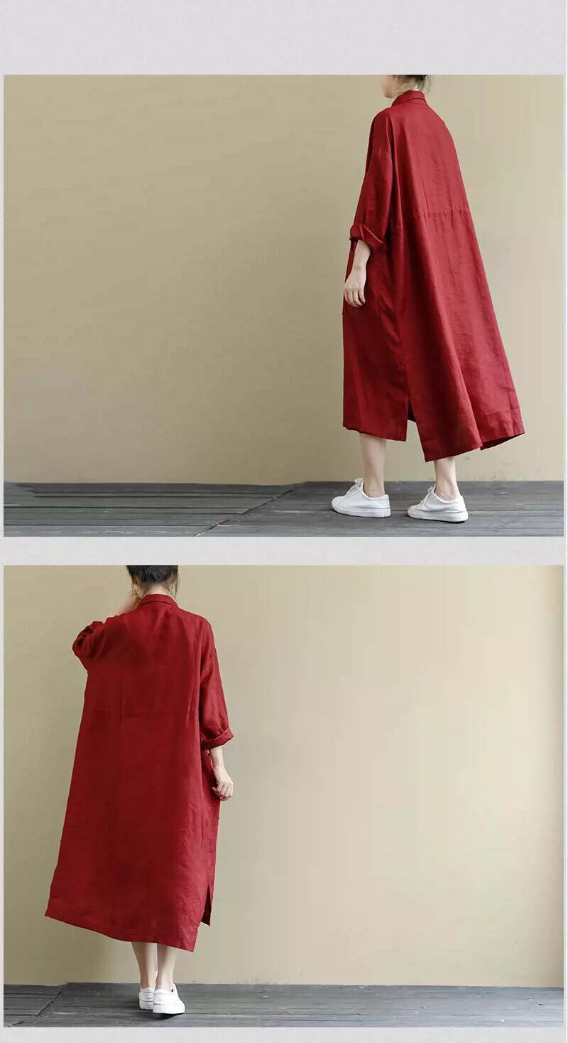 クリアランスリーク〜コットンとリネンの長袖ドレス女性、春と秋のゆったりとしたミドル丈のシングルブレスト無地リネンシャツドレス ロング スプリング 春物 オータム 秋物 ソリッドカラー sine54246855794