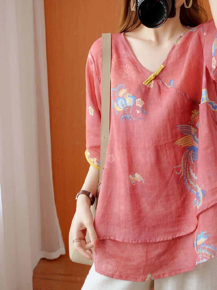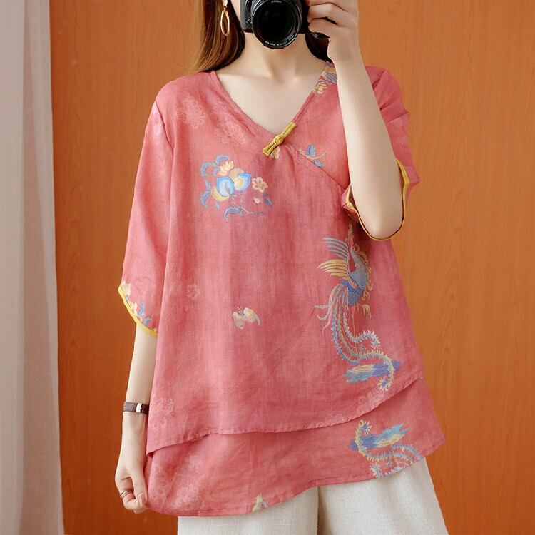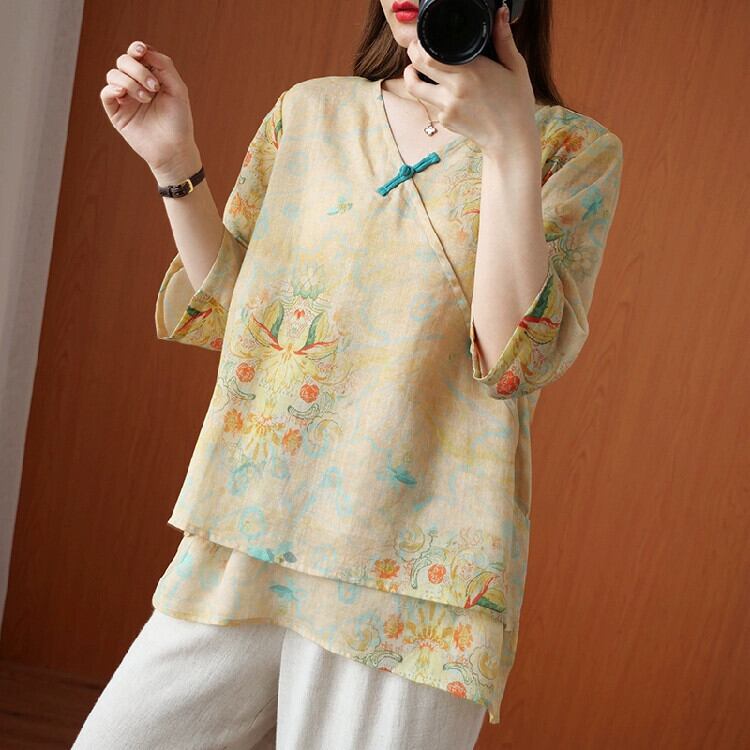 2021 新しい夏の綿とリネンシャツ女性ルーズ脂肪ミリメートル中国風ディスクボタン印刷大きいサイズの女性のラミー半袖トップス コットン 大きめサイズ サマー 夏物 sine51577169246