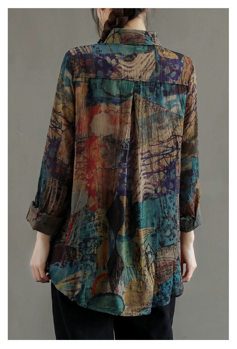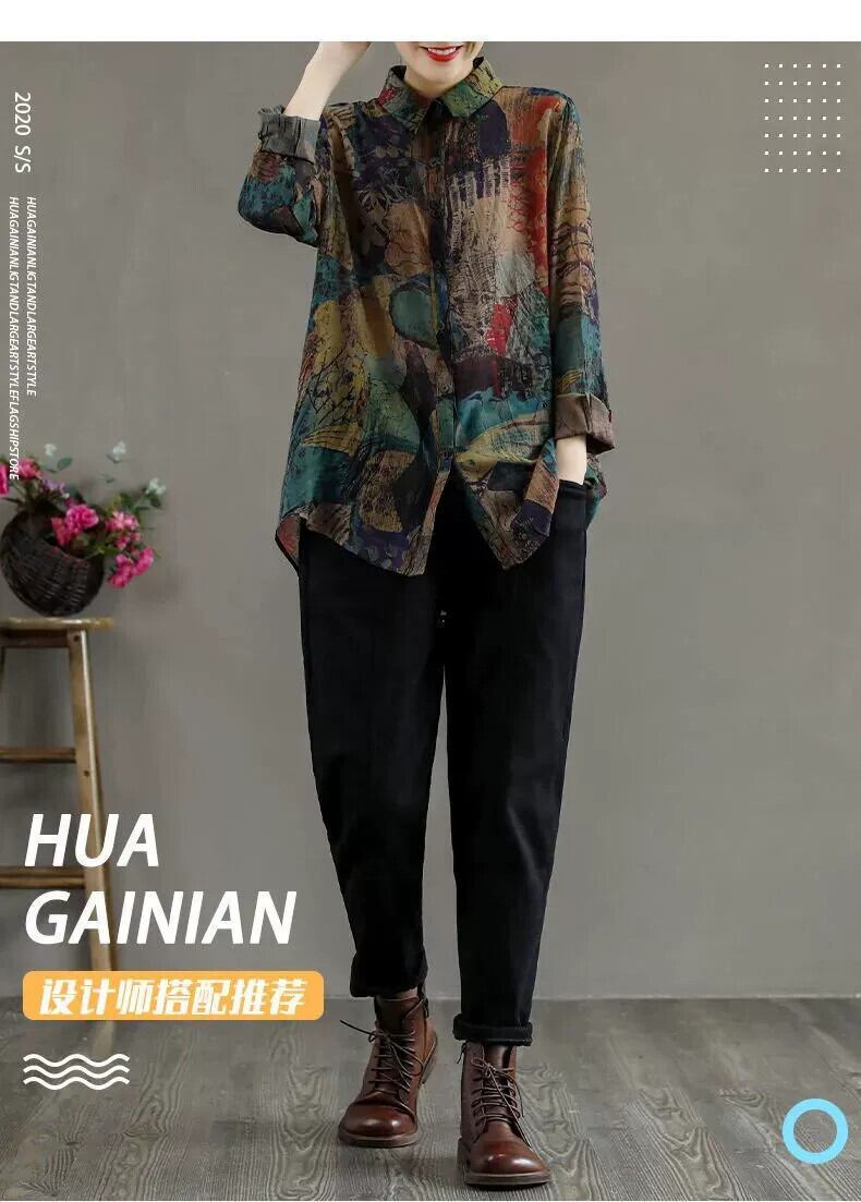 貿易カウンターが大手婦人服の最後のシングルリネンコントラストプリントトップスコットンとリネンの長袖シャツを撤収 ロング sine31654362850