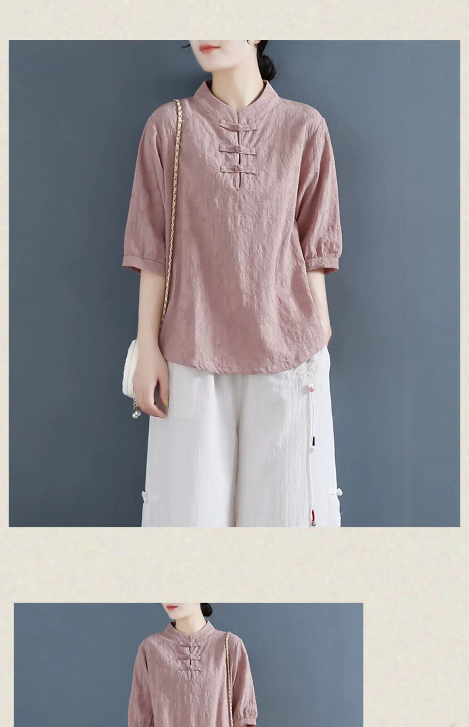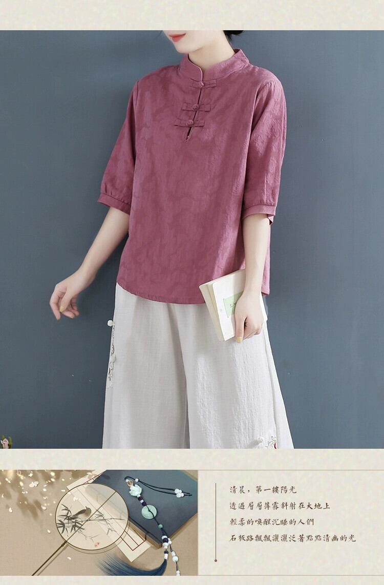 中国貿易輸出オリジナルクリアランスレディースシアーマーク中国ジャカードプレートボタンミッドスリーブトップコットンリネン半袖シャツ sine22416591487