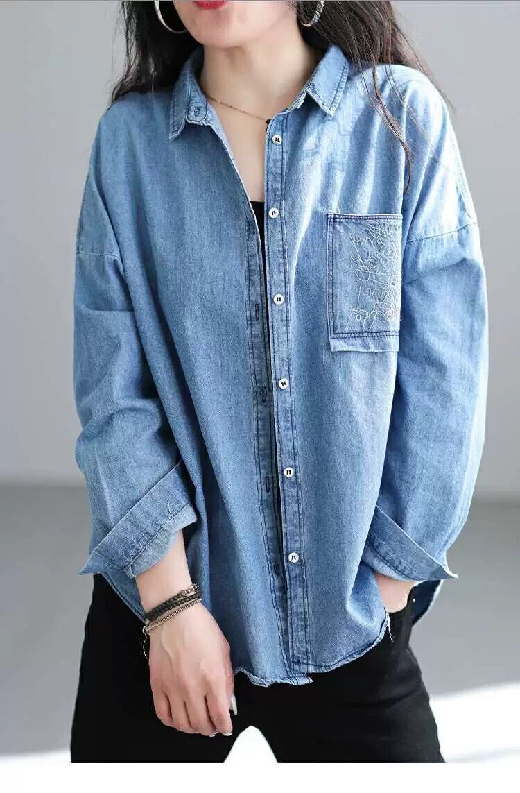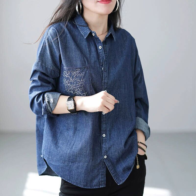 クリアランスリーク〜eseオリジナルのビッグネームレディースカジュアルラペル長袖ジャケットルーズレトロ刺繍デニムシャツ ロング レッド sine73636592752
