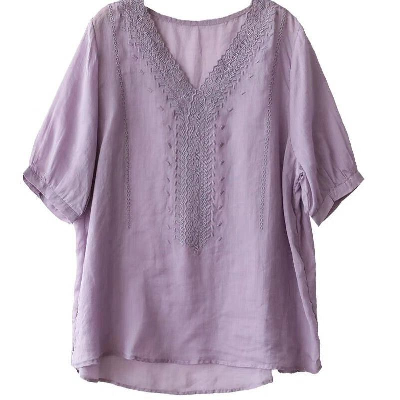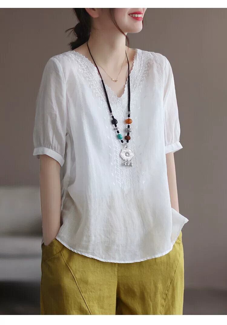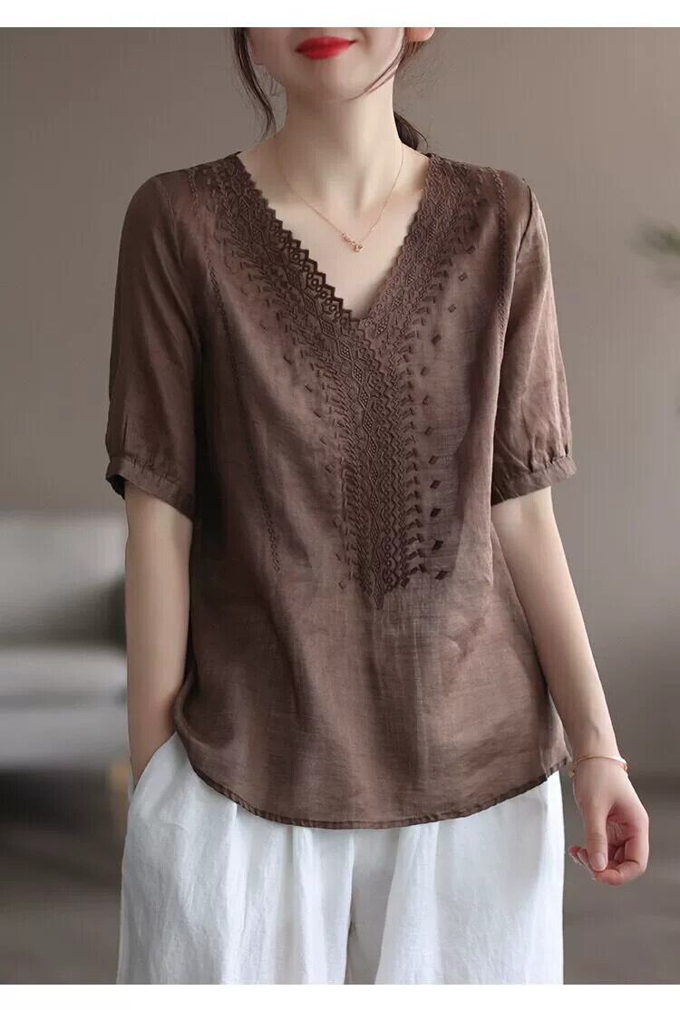 レディースの軽量ラミー V ネック トップ、レトロな刺繍入りコットン リネン半袖シャツ レッド Vネック sine38215076083