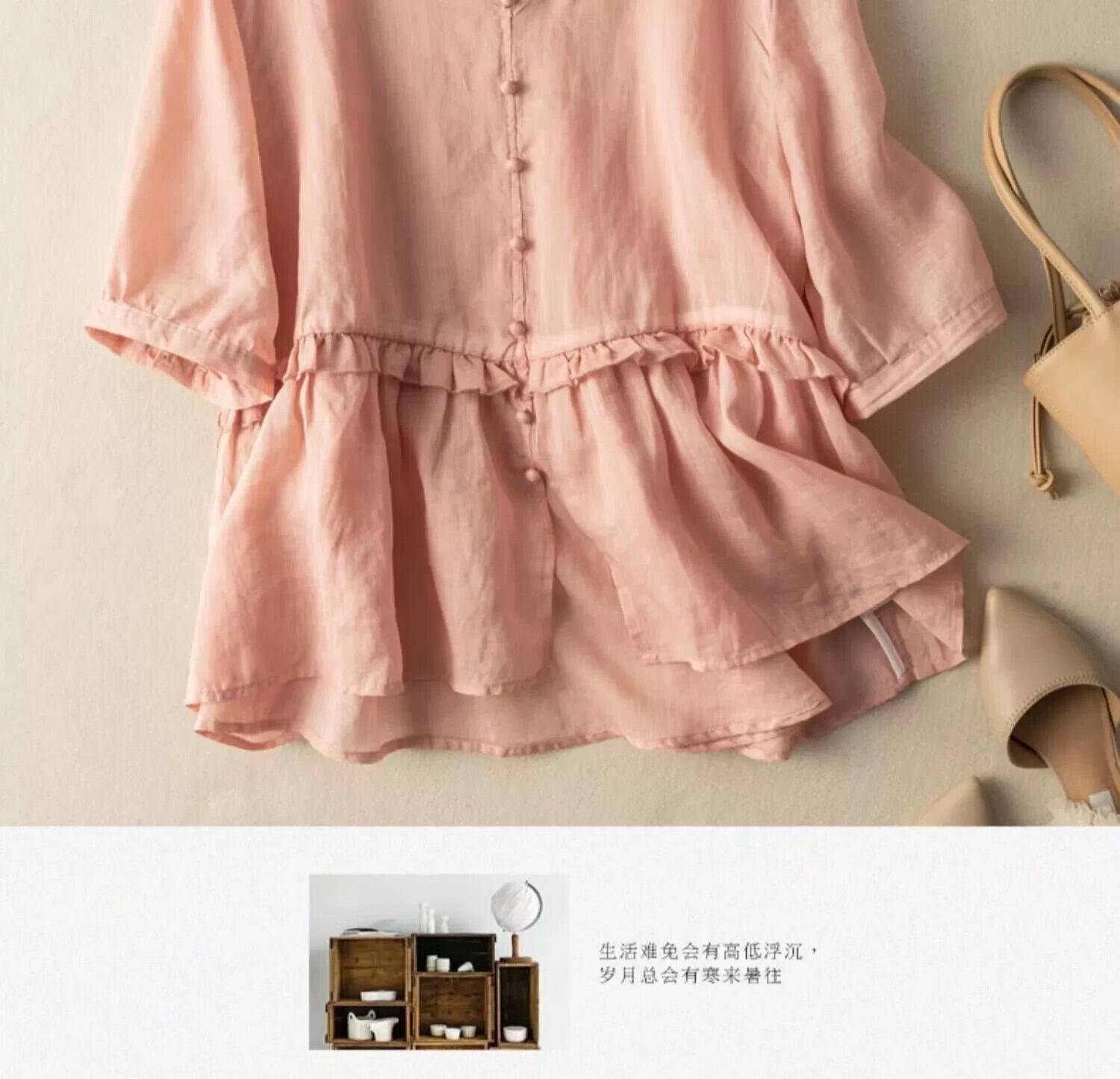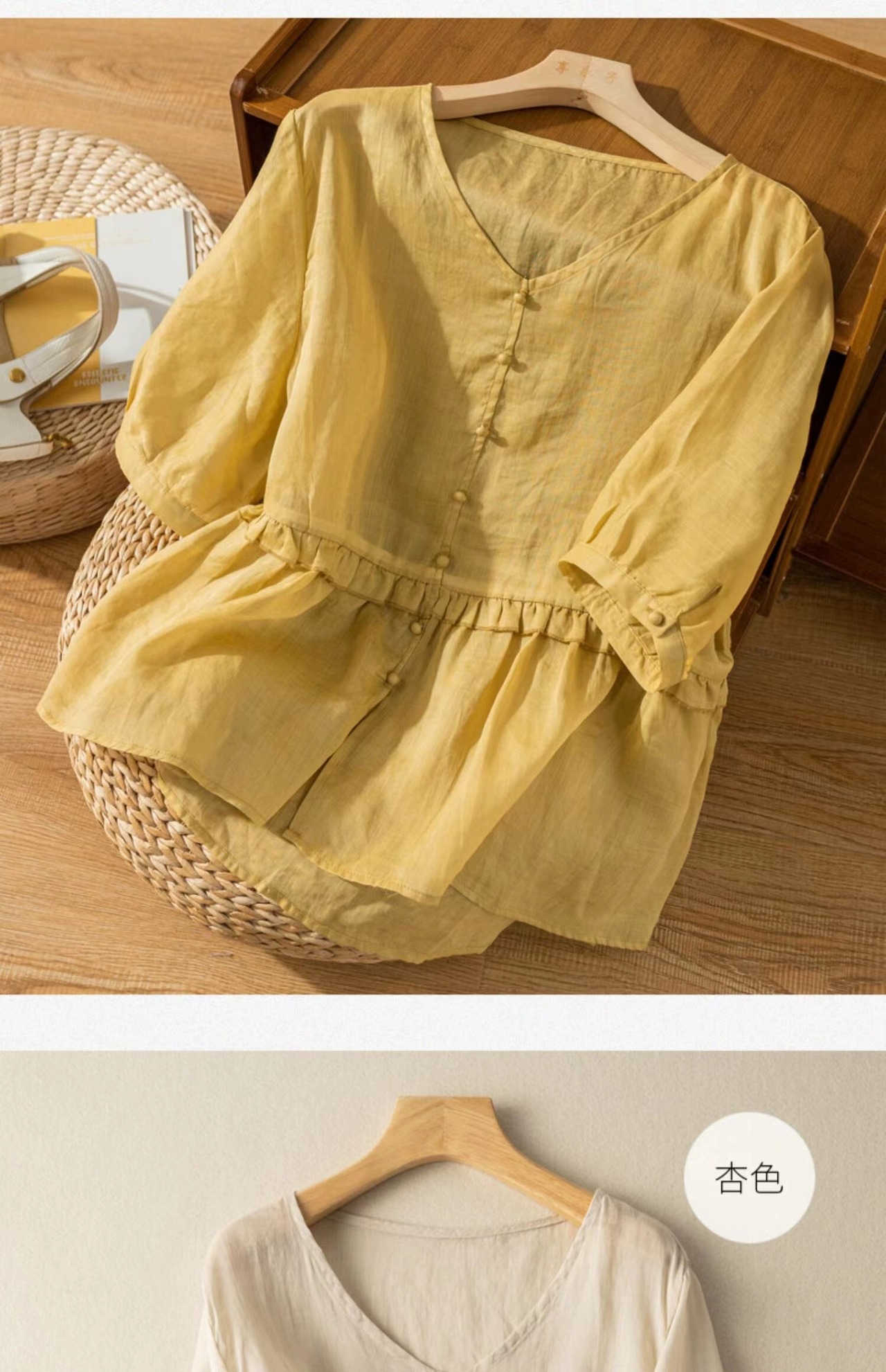 クリアランス漏れ〜カウンタービッグネームシングルレディースレトロVネックコットンリネン半袖シャツルーズベビードールリネントップス sine27705422211
