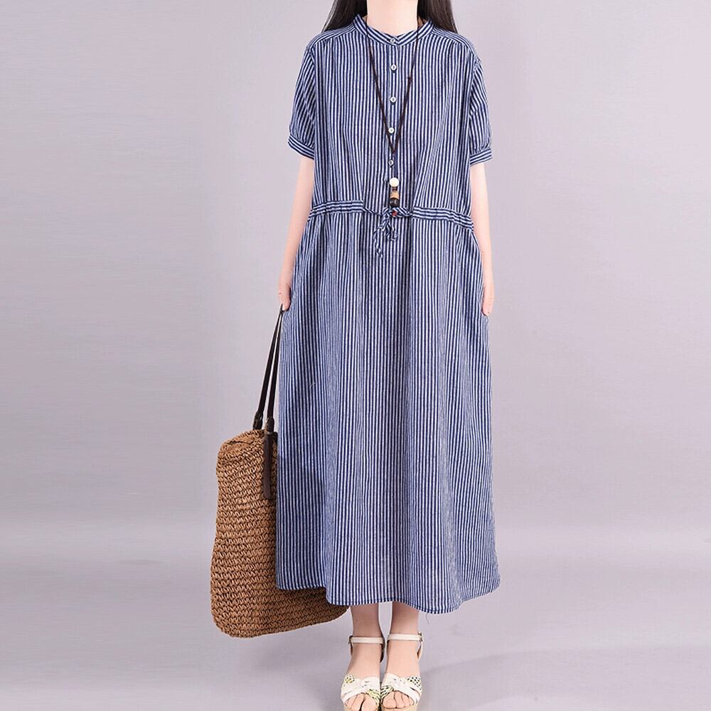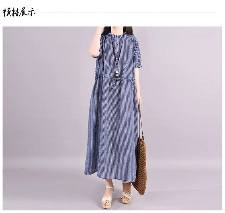 Eign Trade Export Big Tail Goods Cut Label 女性のルーズリネンシャツロングスカートスタイル半袖ストライプコットンとリネンのドレス sine50016387245