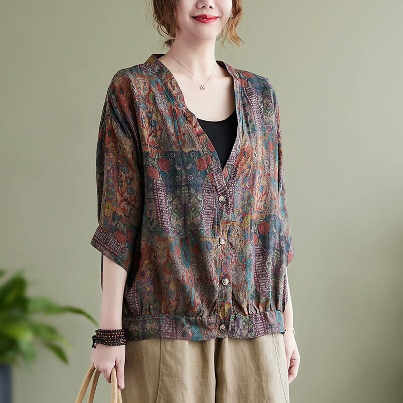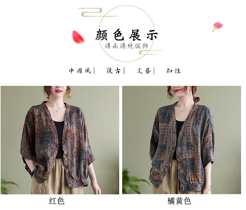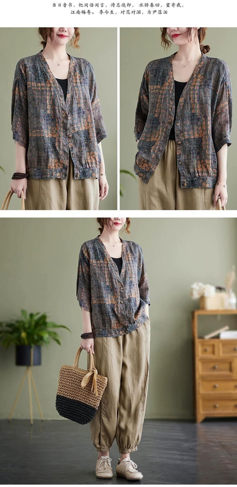 ラミーショートコート、ゆったりとした大きいサイズ、レトロプリント、スリムなVネック、七分袖、薄手のコットンとリネンの日焼け止めトップ女性 大きめサイズ sine66395948049