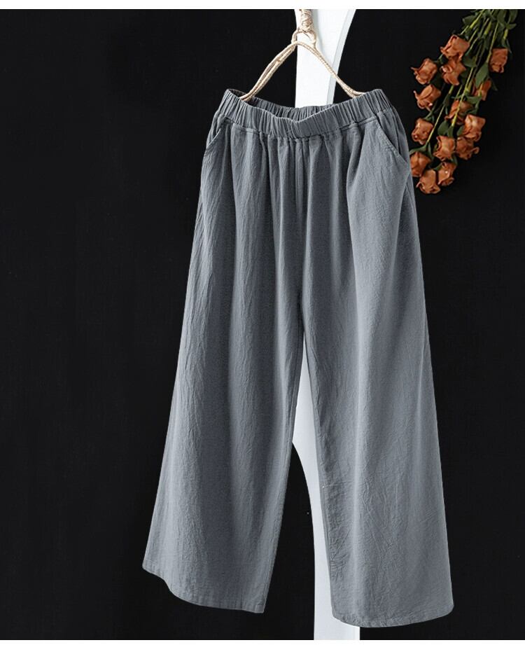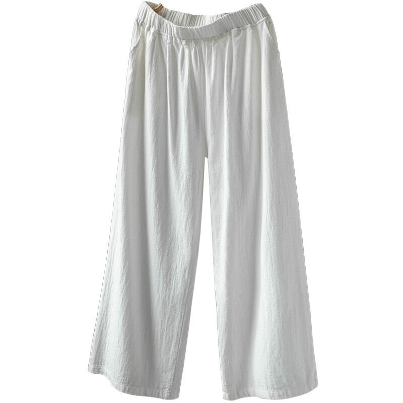 リークをピックアップ〜綿とリネンのワイドレッグパンツの女性、ゆったりとした大きいサイズの5点式ミディアムパンツ、カジュアルな3点式の白のストレートリネン9点式パンツ ホワイト コットン 大きめサイズ sine4422524520