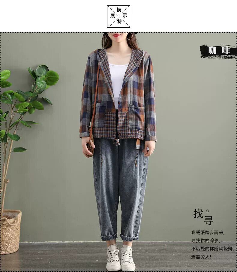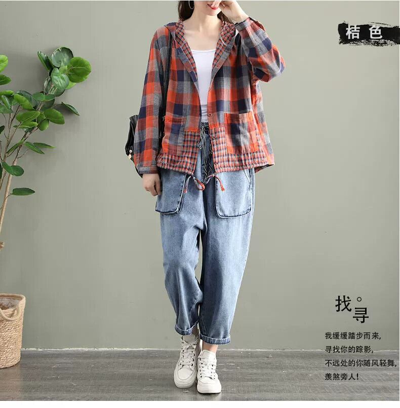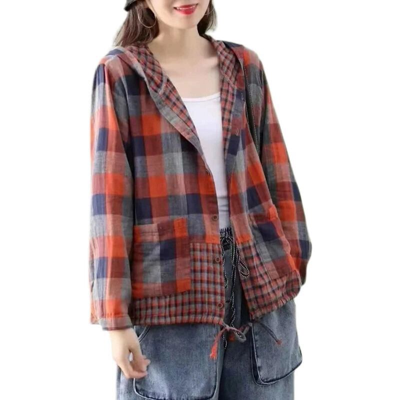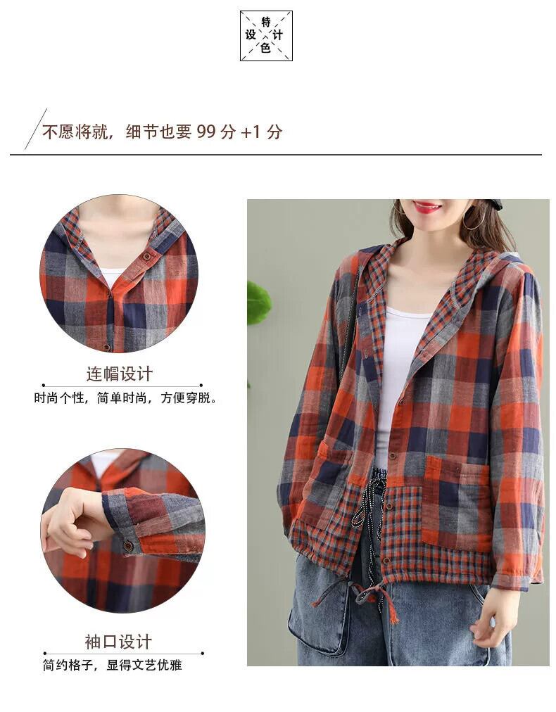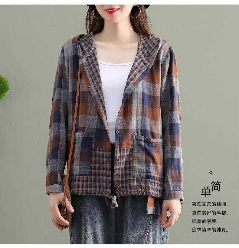 ディスカウント ストア ショッピング モールの女性の綿とリネンのチェック柄フード付きシャツ ジャケット ルーズ レトロ リネン長袖トップ ロング コットン sine96867086350
