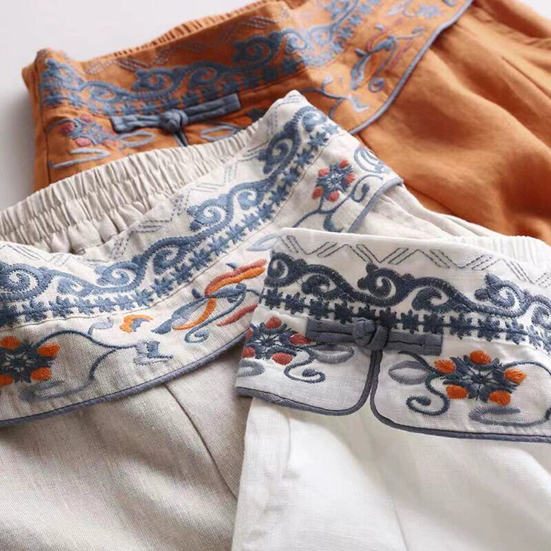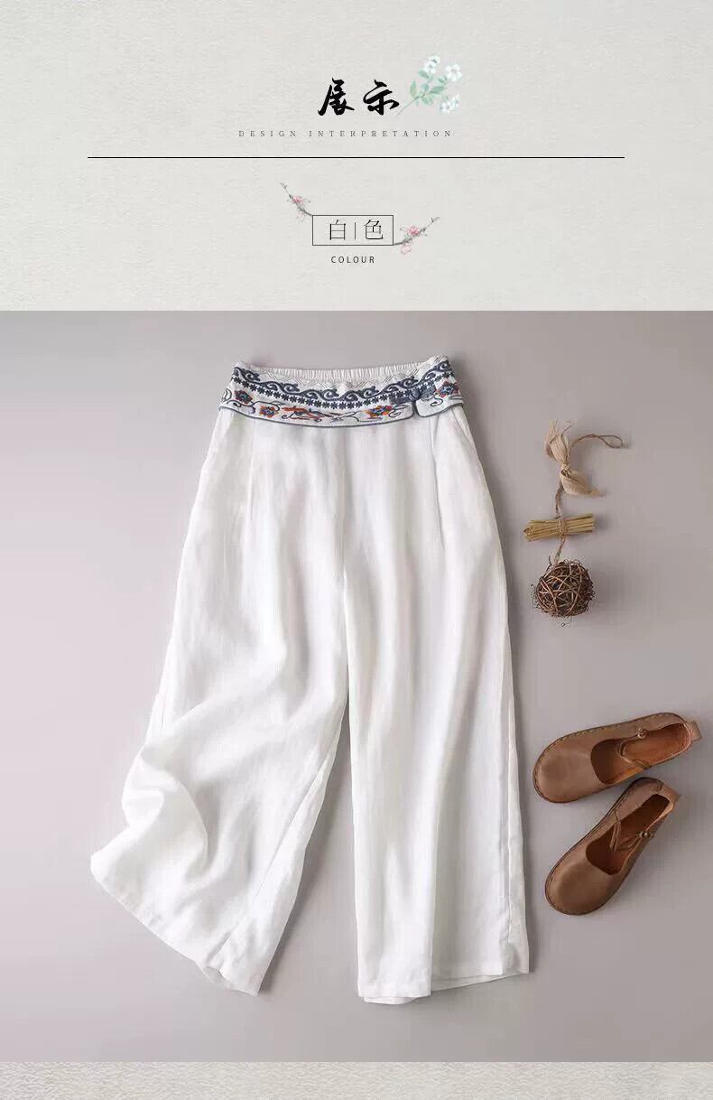ディスカウント ストア ショッピング モールの女性のレトロな刺繍入りコットンとリネンのワイドレッグ パンツ、ルーズ ハイウエスト リネン ストレート 9 点パンツ レッド sine88839331969