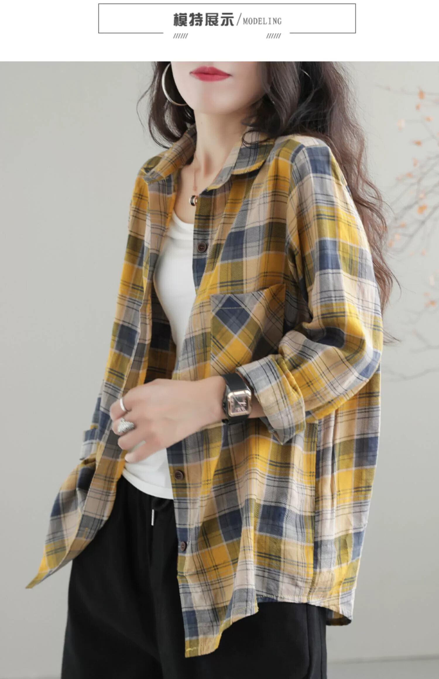 ディスカウントストアの有名カウンター引き出しクリアランスレディースルーズリネン長袖シャツカジュアルレトロチェック柄コットンリネントップ ロング sine3846394137