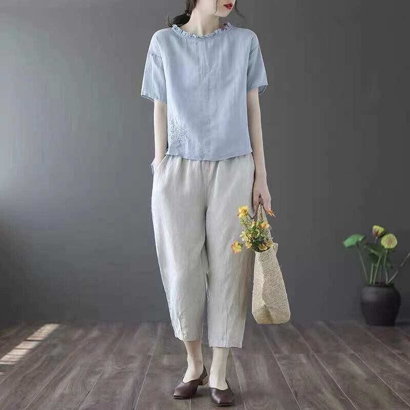 カウンタークリアランスラストシングルレディースレトロ刺繍リネンシャツ薄手トップルーズコットンとリネン半袖Tシャツ レッド sine44794681611
