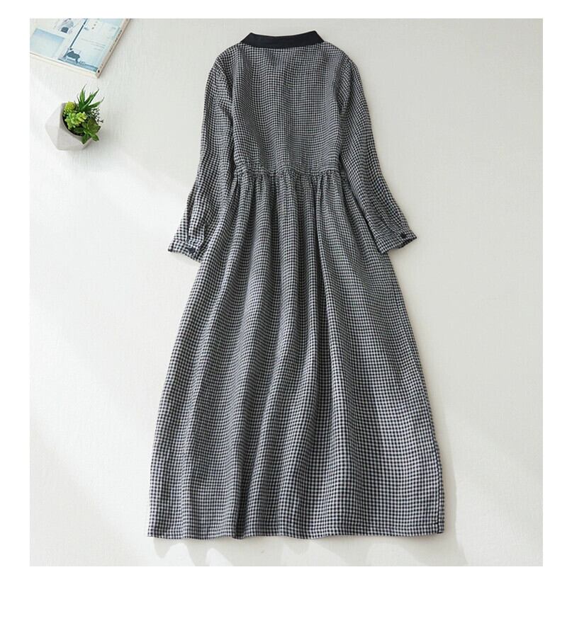 Eign Trade Export Big-name Tail Goods レディース クリアランス コットンとリネン レトロ シャツ ロング スカート ルーズ ウエスト チェック柄 リネン ドレス sine56490460941