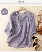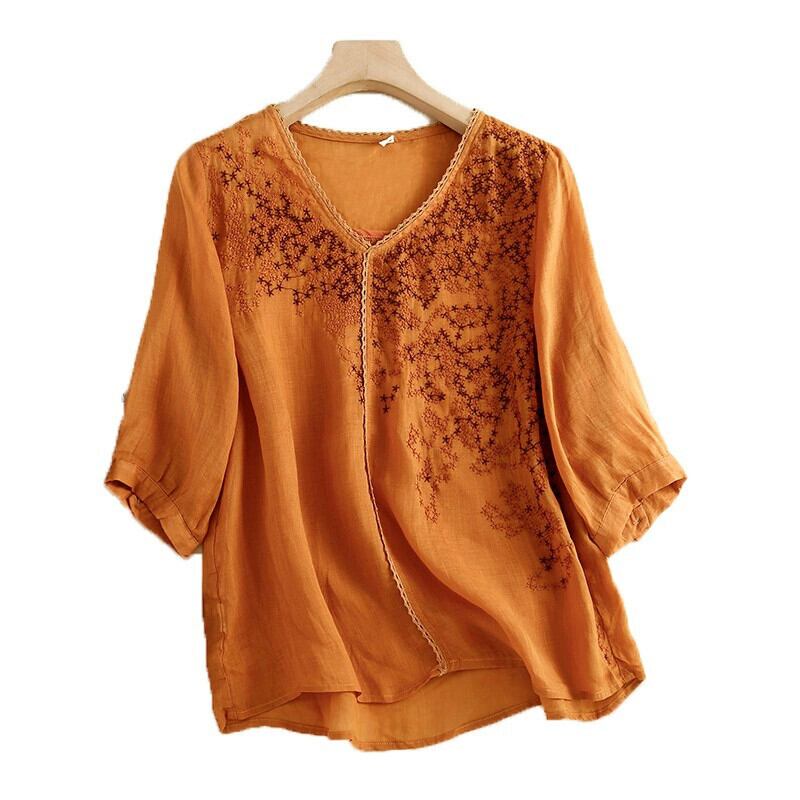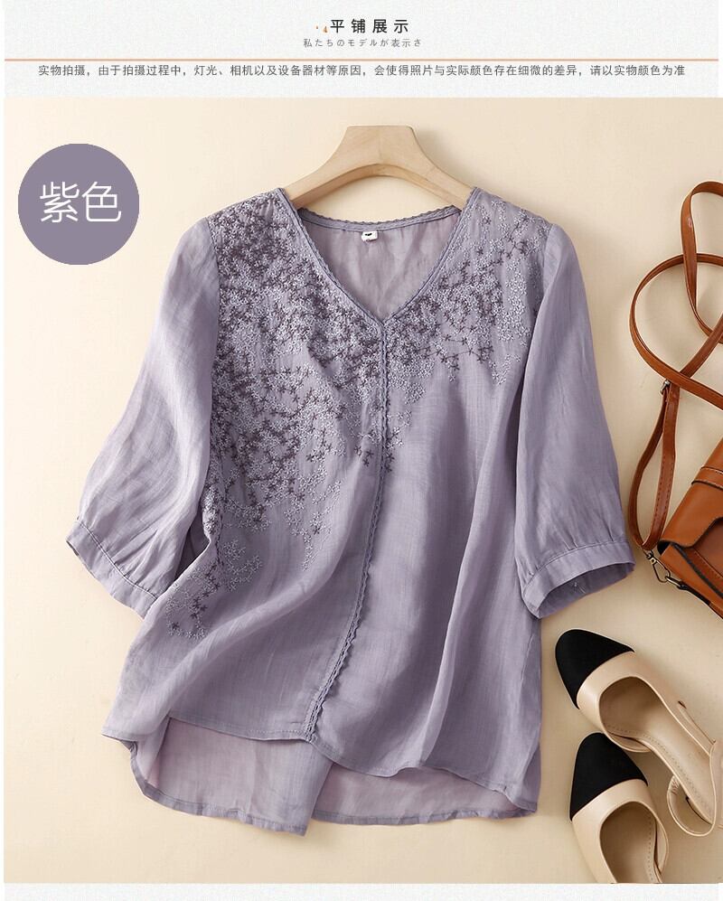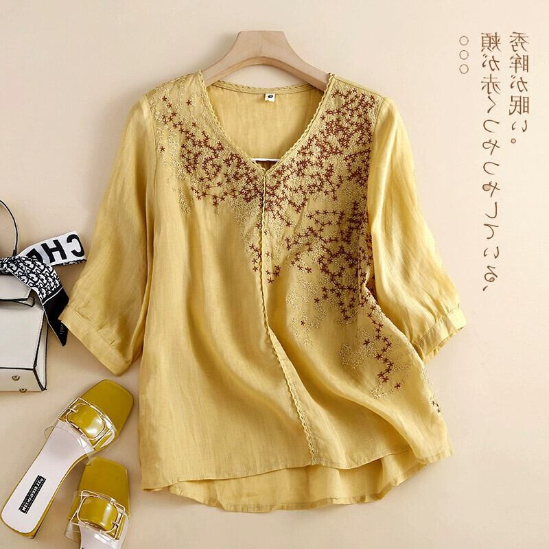 eign trade ese オリジナルハイエンドブランドの女性の薄手の V ネック刺繍リネン薄手のトップスカジュアル綿とリネン半袖シャツ レッド コットン Vネック sine19070282286