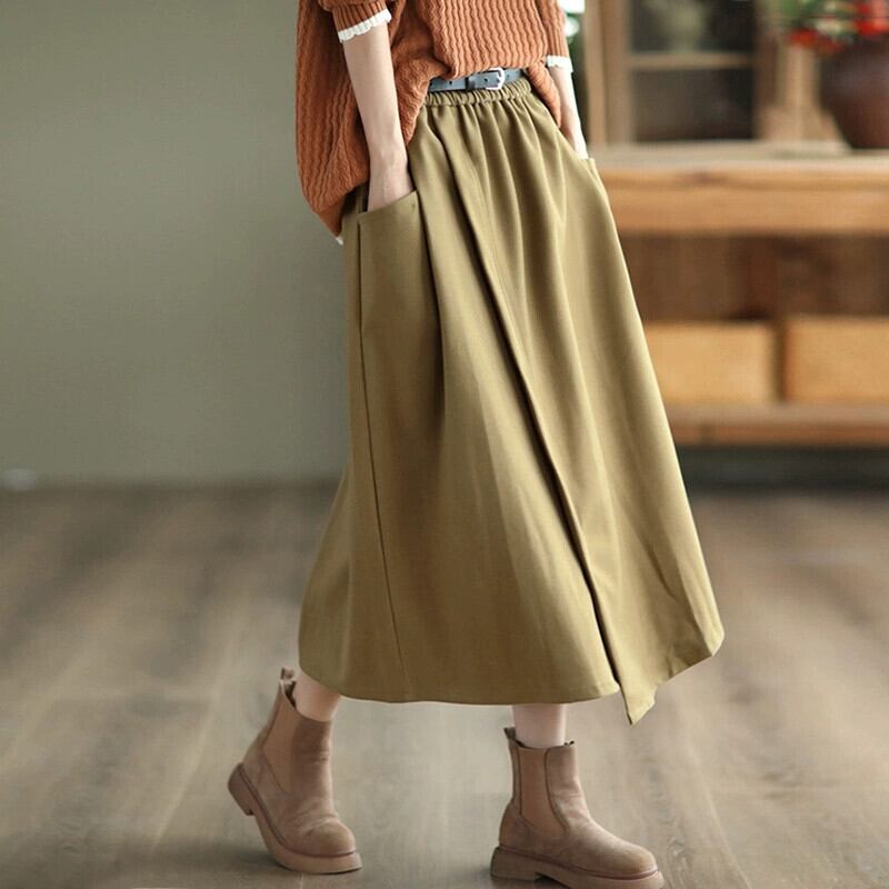 ディスカウントストアショッピングモールの女性のレトロな無地の A ラインスカートルーズ痩身ハイウエストロングスカート Aライン ソリッドカラー sine93960148627