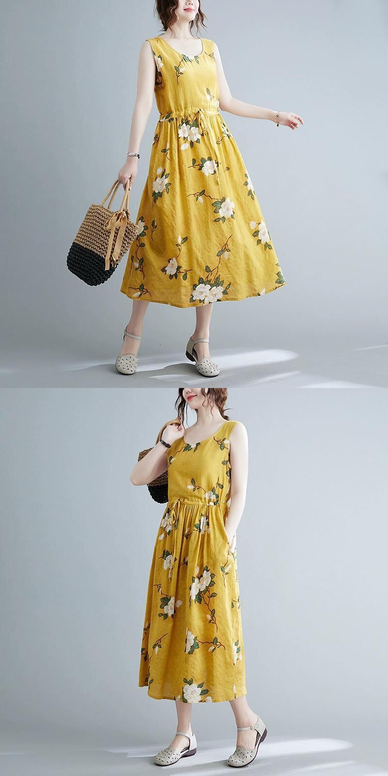 エスニックスタイルの綿とリネンのドレス夏 2022 ゆったりとした大きいサイズのパターンハイウエスト大きな裾ノースリーブベストリネンミドル丈スカート ハイウェスト コットン 大きめサイズ サマー 夏物 sine77089620318