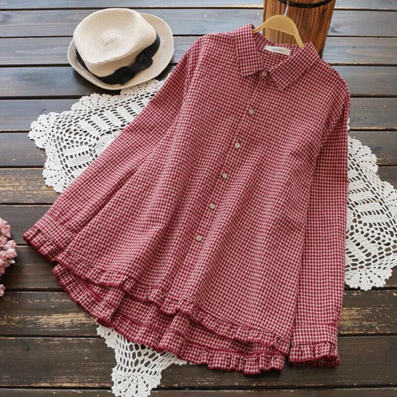 eign trade ese オリジナルハイエンドブランドの女性のレトロリネンチェック柄長袖シャツ秋ルーズ痩身綿とリネントップ ロング コットン オータム 秋物 sine80647455291