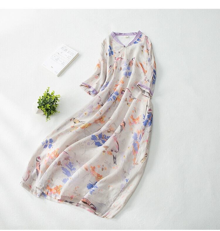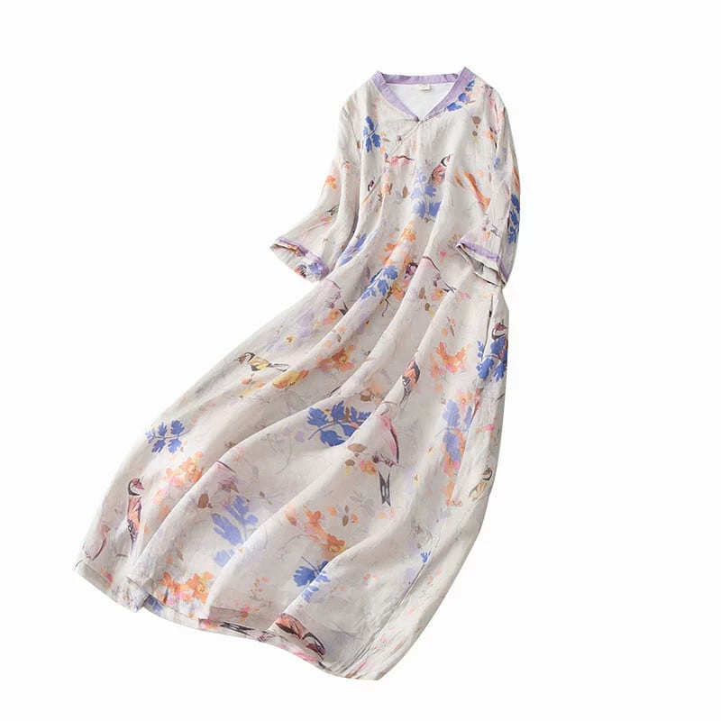 カットラベルショッピングモール撤退女性のレトロな綿とリネンのドレス中国風斜めラペル改良されたチャイナドレスプリントラミーロングスカート コットン sine37733510434