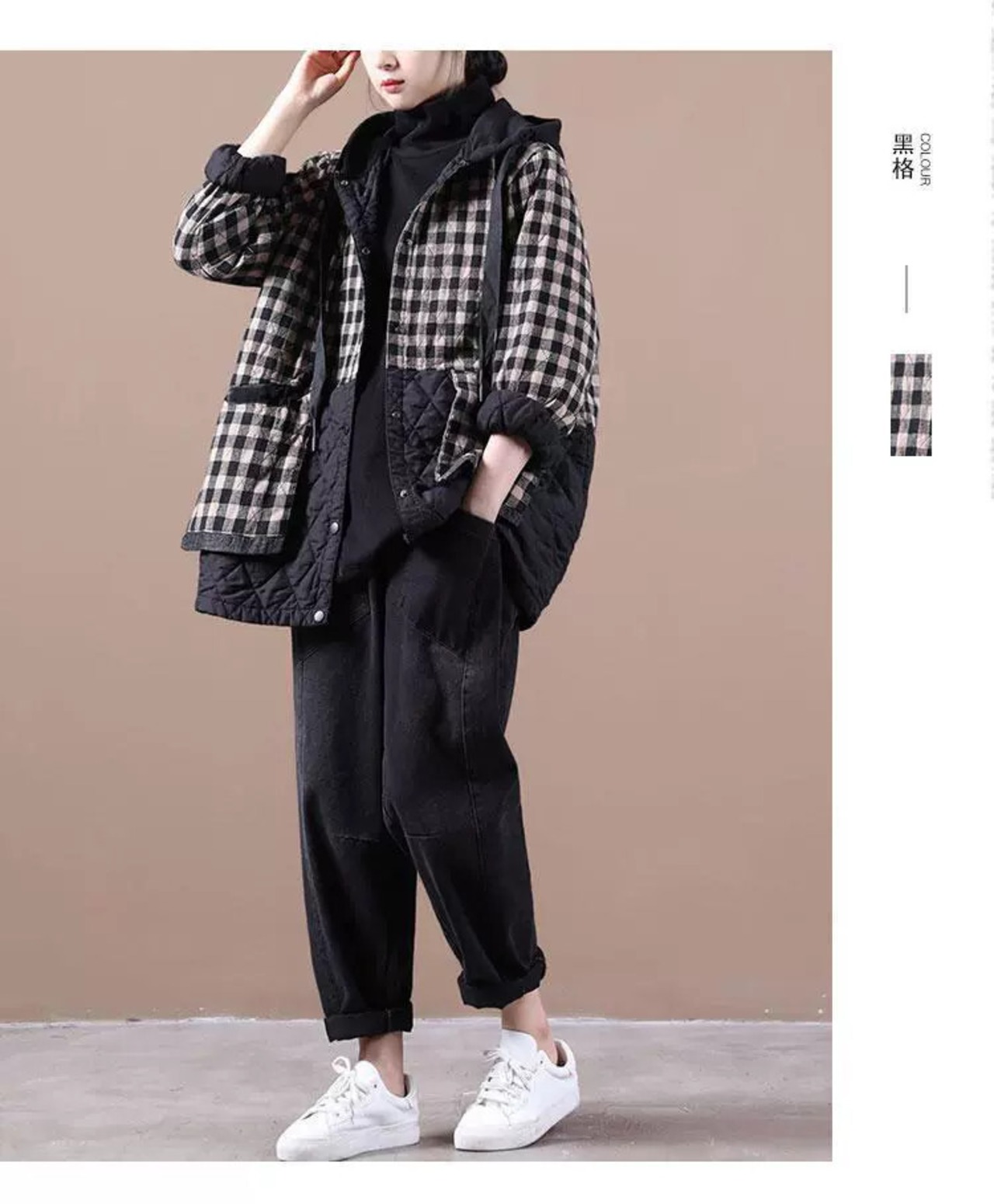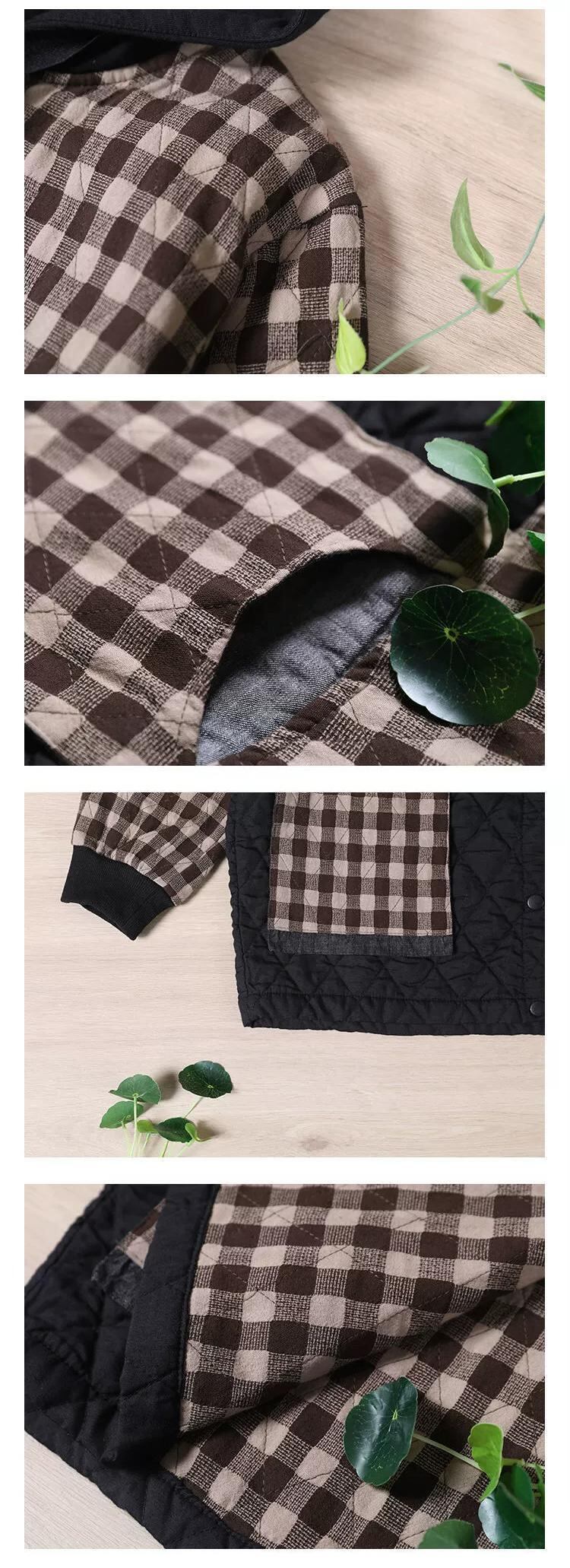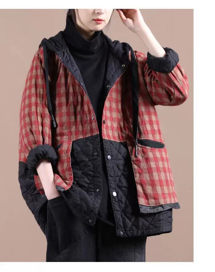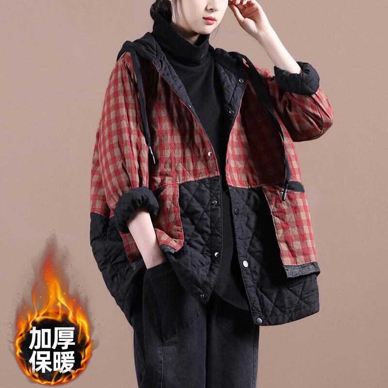 クリアランスカウンター除去ビッグブランドレディースルーズチェック柄フード付き暖かいコットンとリネンジャケットレトロライトダウンコート sine85586740284