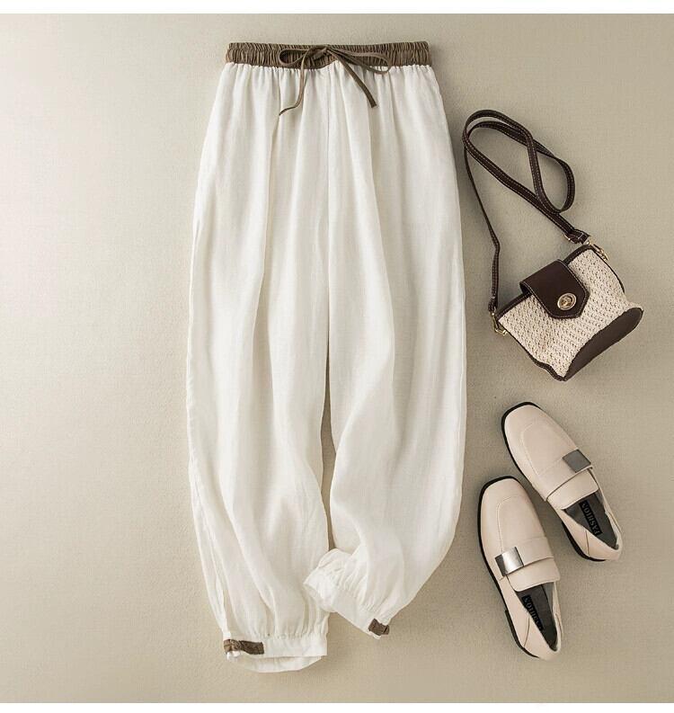 eign trade ese オリジナルシングルビッグネーム撤退コットンとリネンレギンスハーレムパンツ女性ハイウエストレースアップリネンカジュアル 9 ポイントスウェットパンツ sine44989359585