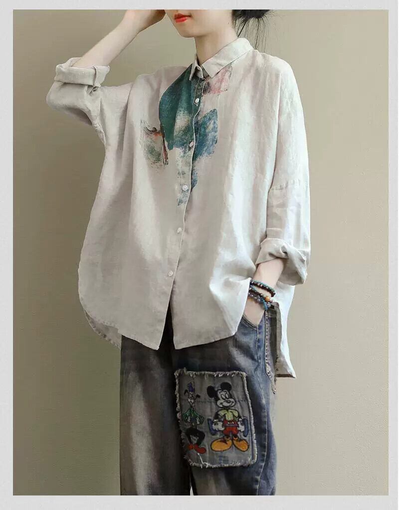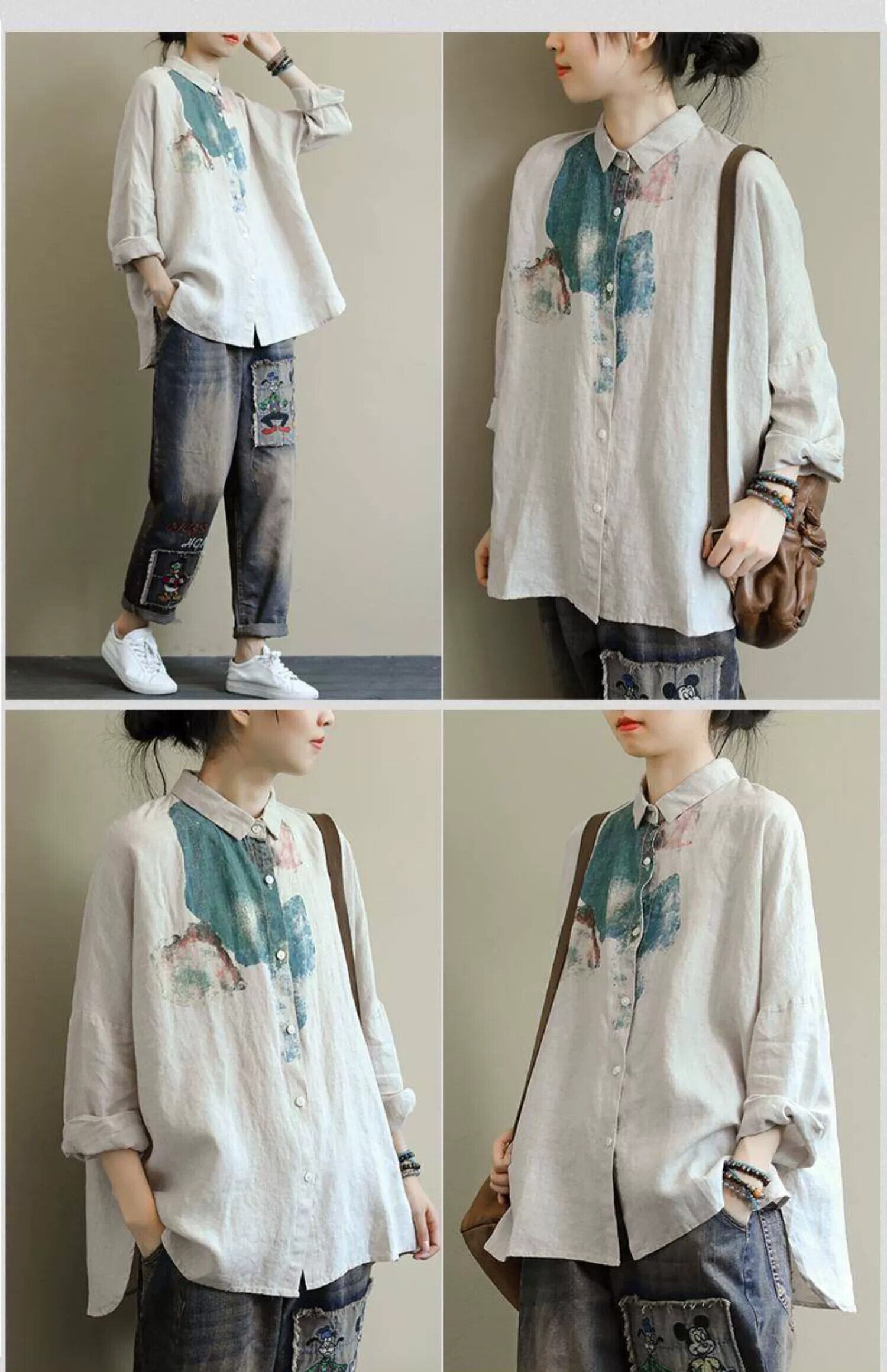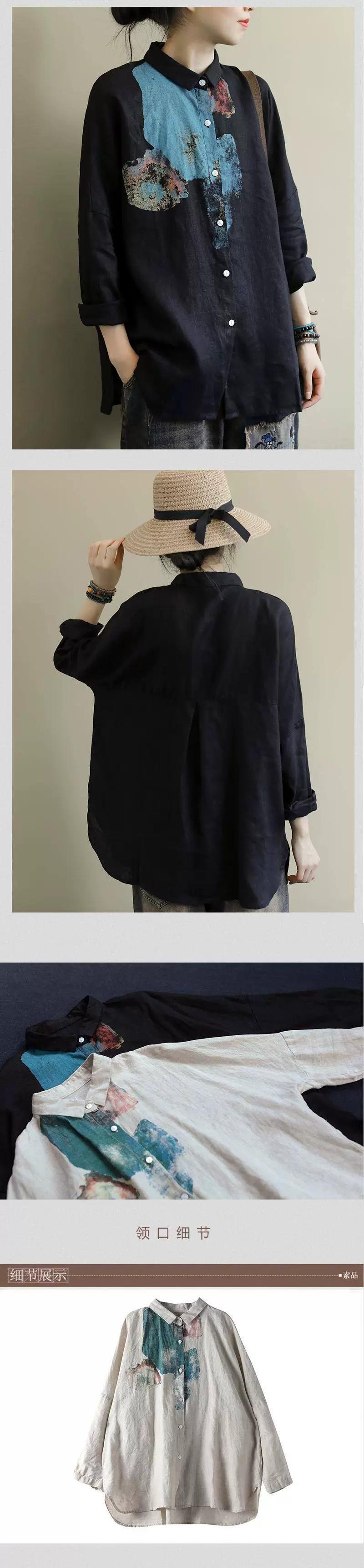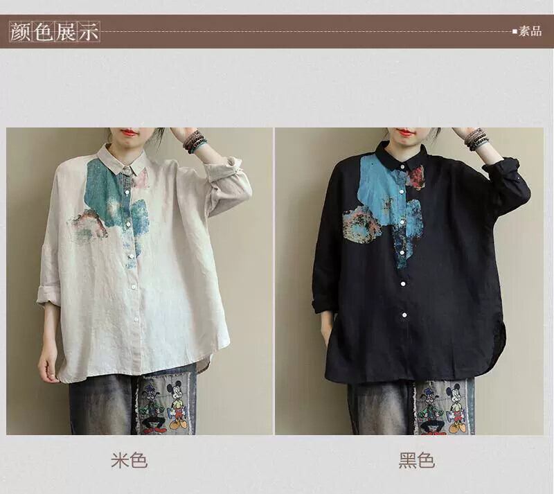 クリアランスクリアランス〜eign tradeカウンター削除レディースラペルプリントリネンシャツルーズレトロ長袖ラミートップ ロング sine51827744456
