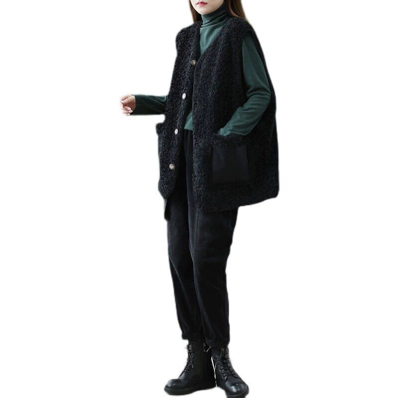クリアランスクリアランス婦人服レトロな大きなポケット V ネック肥厚ベストベスト緩いチョッキラムウールコート Vネック sine80625801637