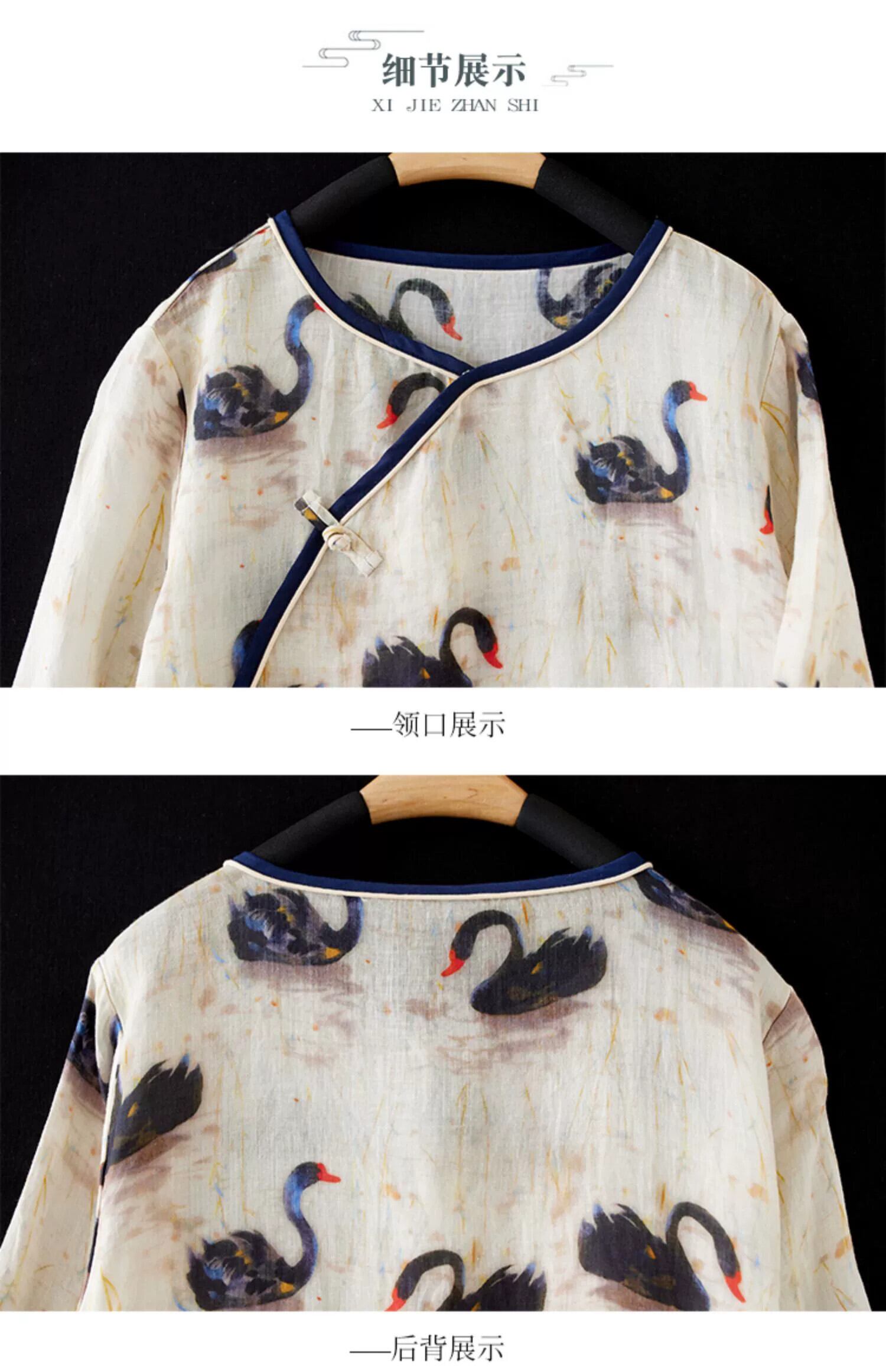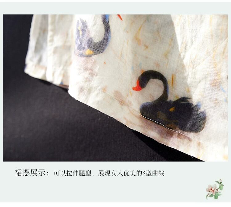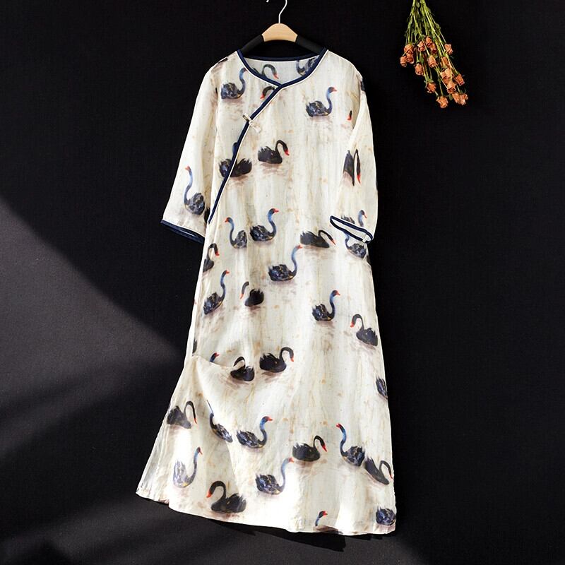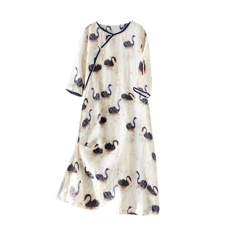 クリアランス漏れ〜有名店の女性用中国風改良ブラックスワンプリント綿麻半袖チャイナドレス コットン sine92182574113