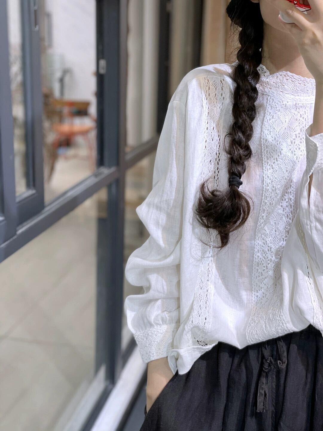 クリアランスクリアランスカウンター牛物品除去レディースエーゼレースステッチコットンとリネンシャツルーズプルオーバーリネントップ sine93132360619