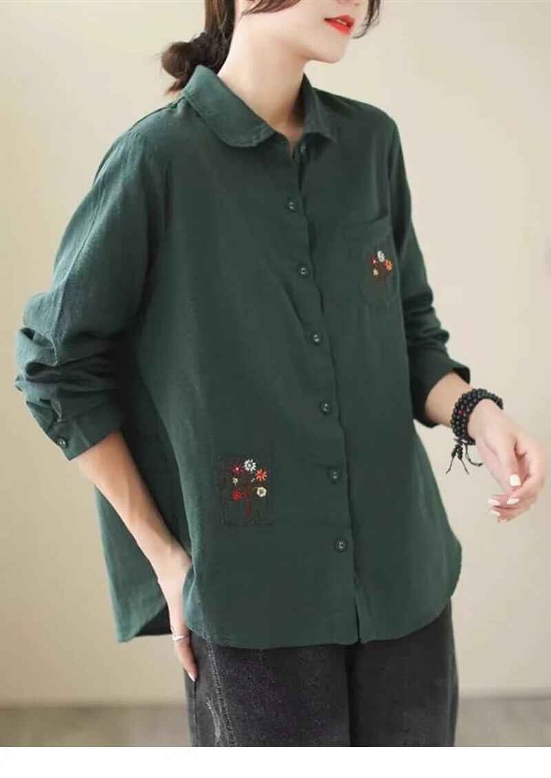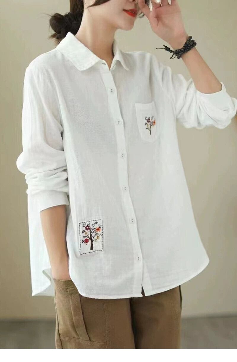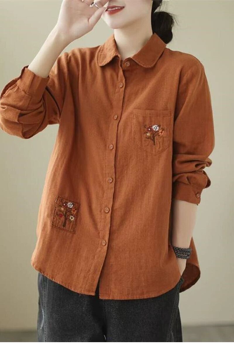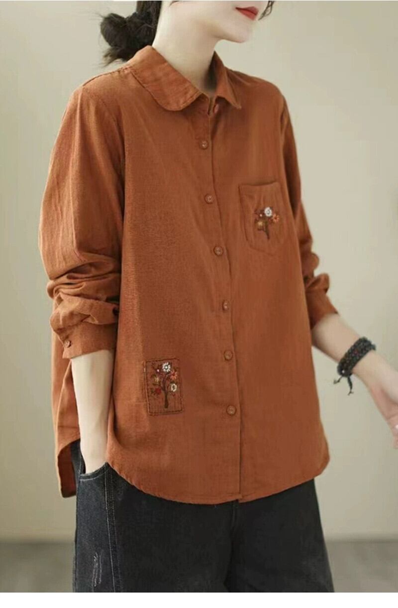 クリアランス漏れ ~ 有名ブランドの女性向け商品、ゆったりとしたレトロな刺繍パッチのラペル、カジュアルなコットンとリネンの長袖シャツ ロング レッド sine68582873952