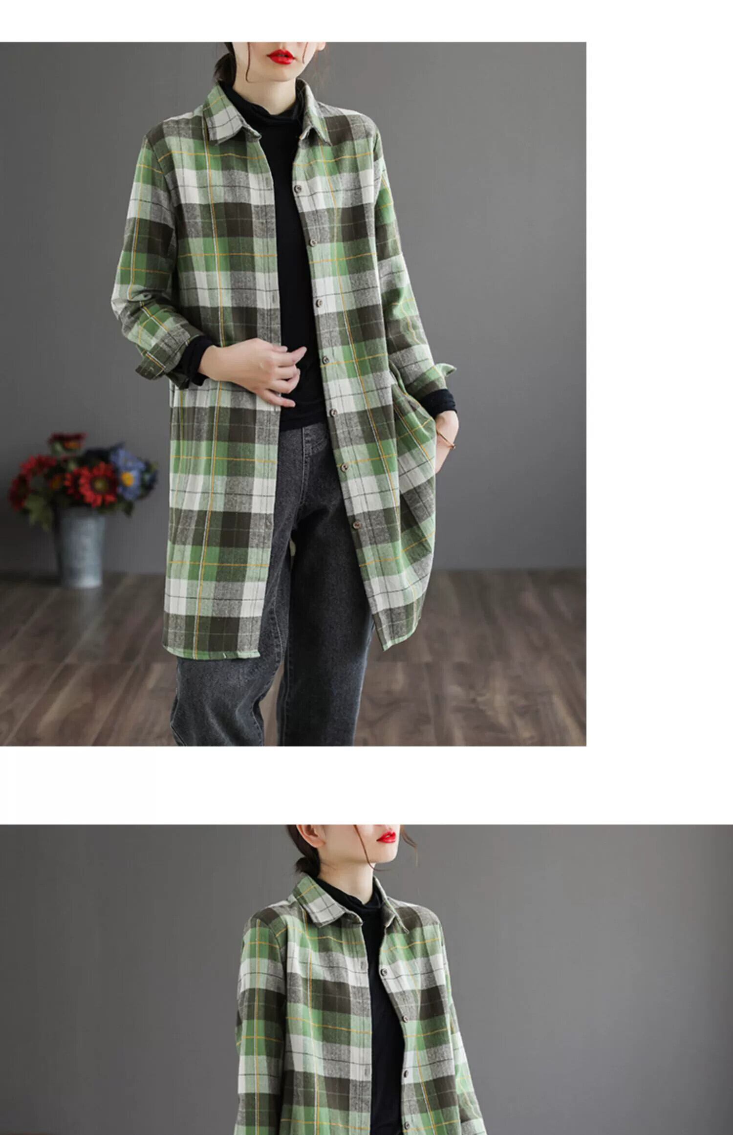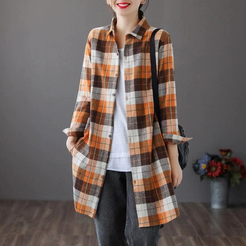eign trade ese ビッグネームカウンター在庫なしレディース起毛長袖チェック柄シャツルーズレトロミッドレングスリネントップ ロング sine70065370745