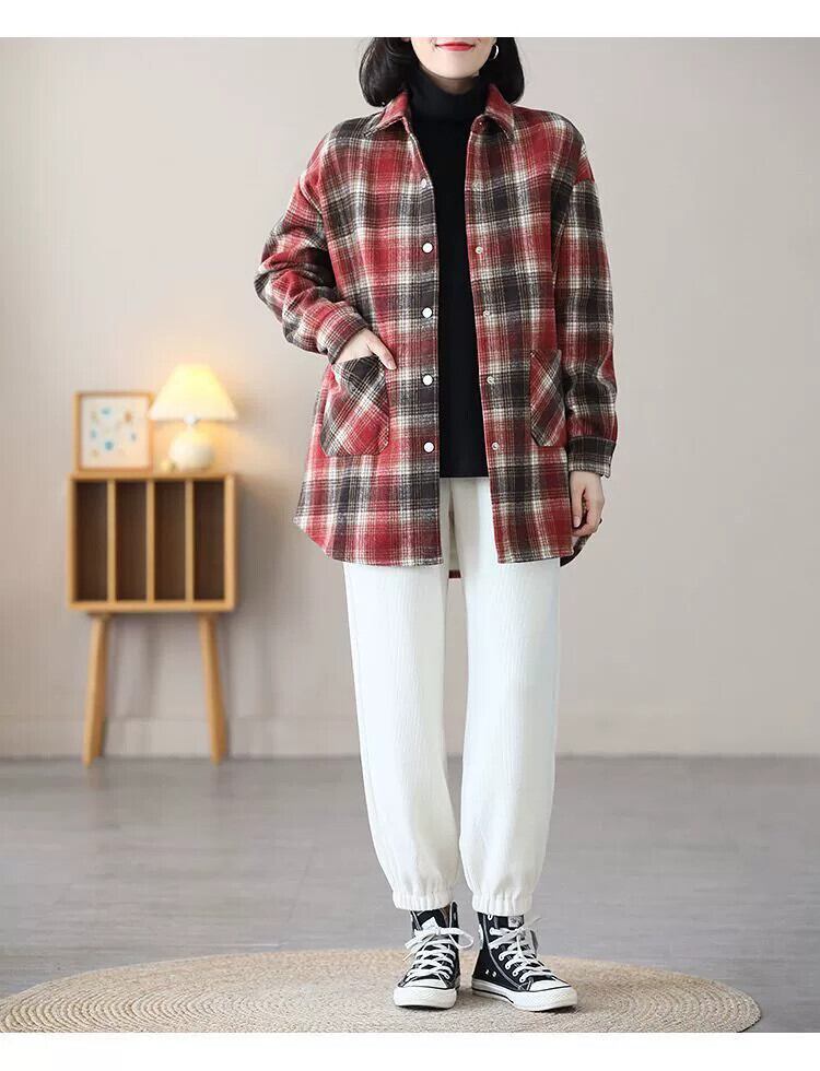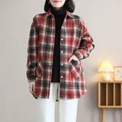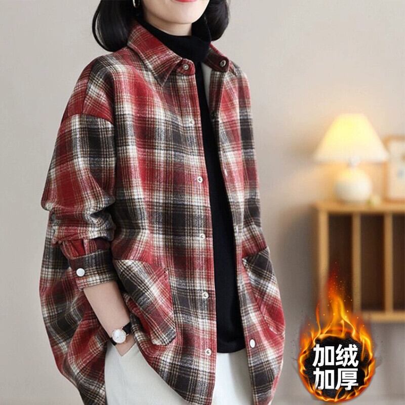 クリアランス漏れ ~ 女性用のレトロな起毛チェック柄シャツ ジャケット、ルーズ ベルベットと厚みのあるラペル トップ、カウンターで販売 sine72965969952