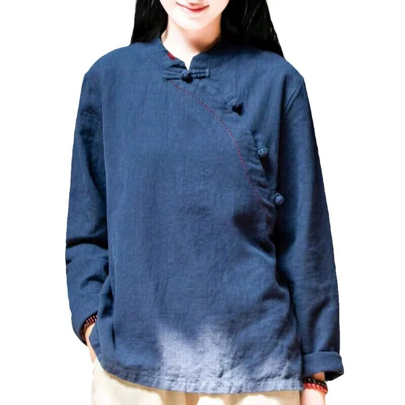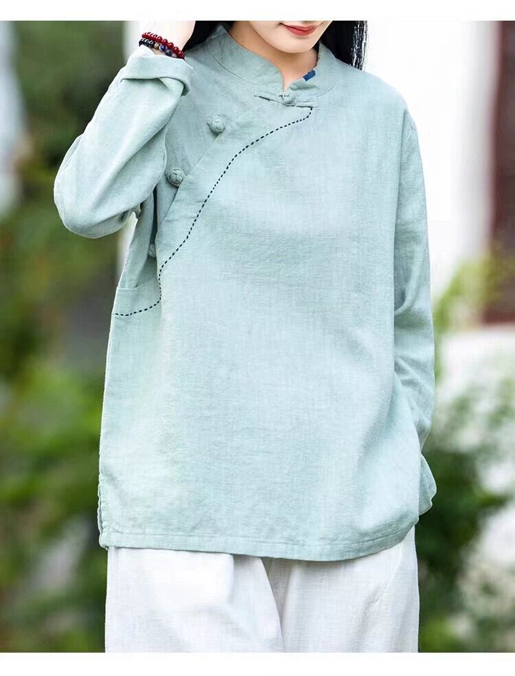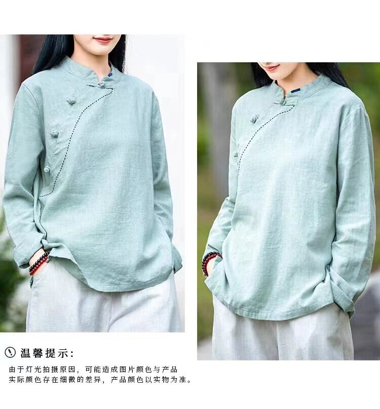 漏れを拾ってください!有名商品のカウンター撤去、レトロなコットンとリネンのスタンドカラー シャツ、女性用のゆったりとした斜めの前立てのボタン付きリネン トップ sine2032415030