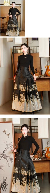 中国風明織金馬スカート女性春と秋のハイエンド国民風黒長袖ボトシャツ Tシャツ 2 点セット ロング ブラック スプリング 春物 オータム 秋物 sine24477864185