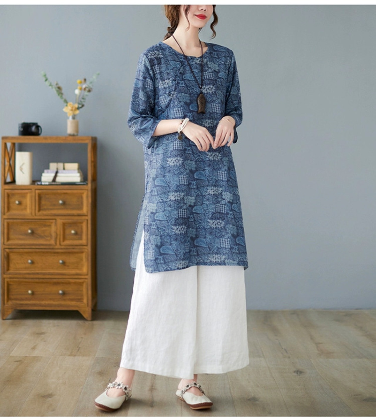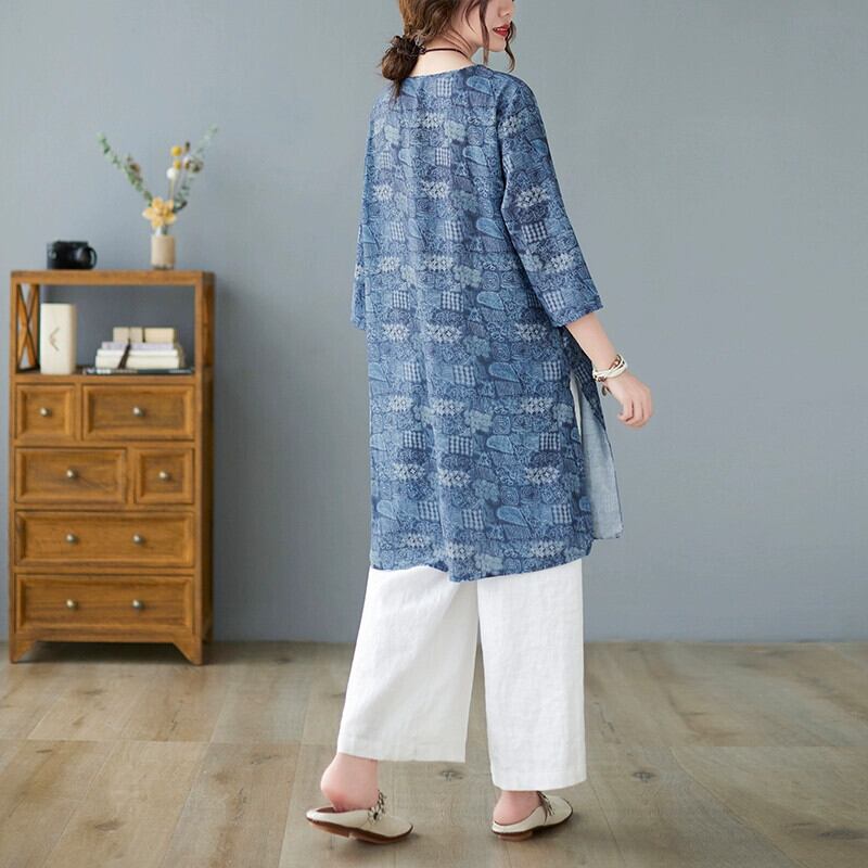 気質とファッショナブルな綿とリネンのスーツの女性、夏のプリントの七分袖、ミドル丈のシャツ、カジュアルなワイドレッグパンツ、リネンの2点セット コットン サマー 夏物 sine12744799946
